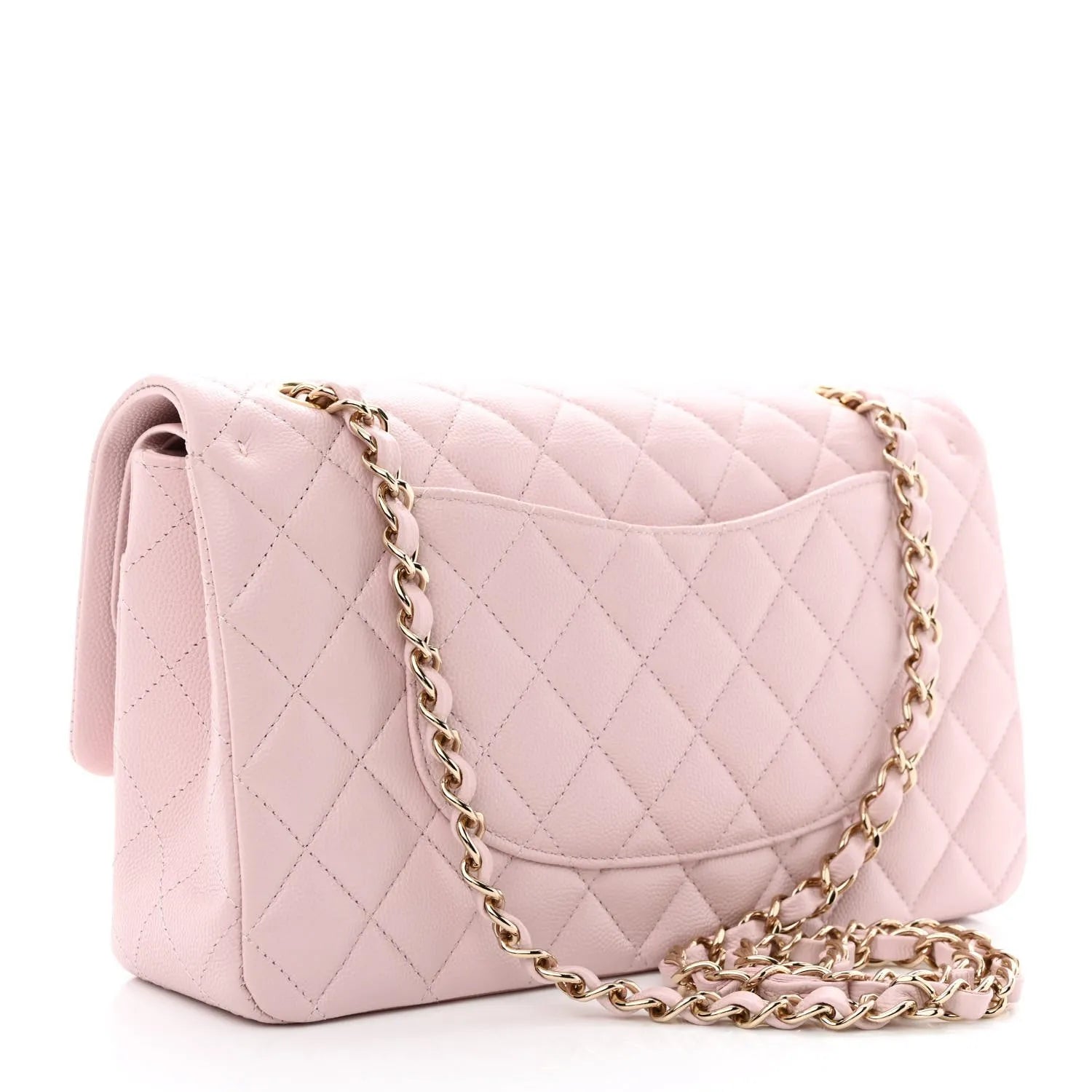 This is an authentic CHANEL Caviar Quilted Medium Double Flap in Light Pink. This medium classic flap bag is beautifully crafted of luxurious light pink caviar leather. The bag features a gold chain-link shoulder strap threaded with pink leather, a crossover flap, and a gold Chanel CC turn-lock on the front. This handbag opens to a second flap and a matching pink matte leather interior with patch pockets.