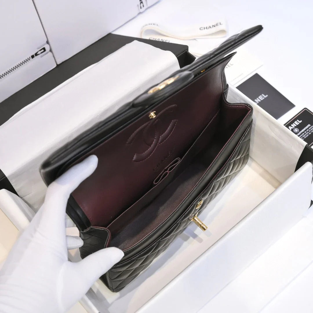 CHANEL Classic Double Flap Black Lambskin Gold Hardware A01112 25cm
