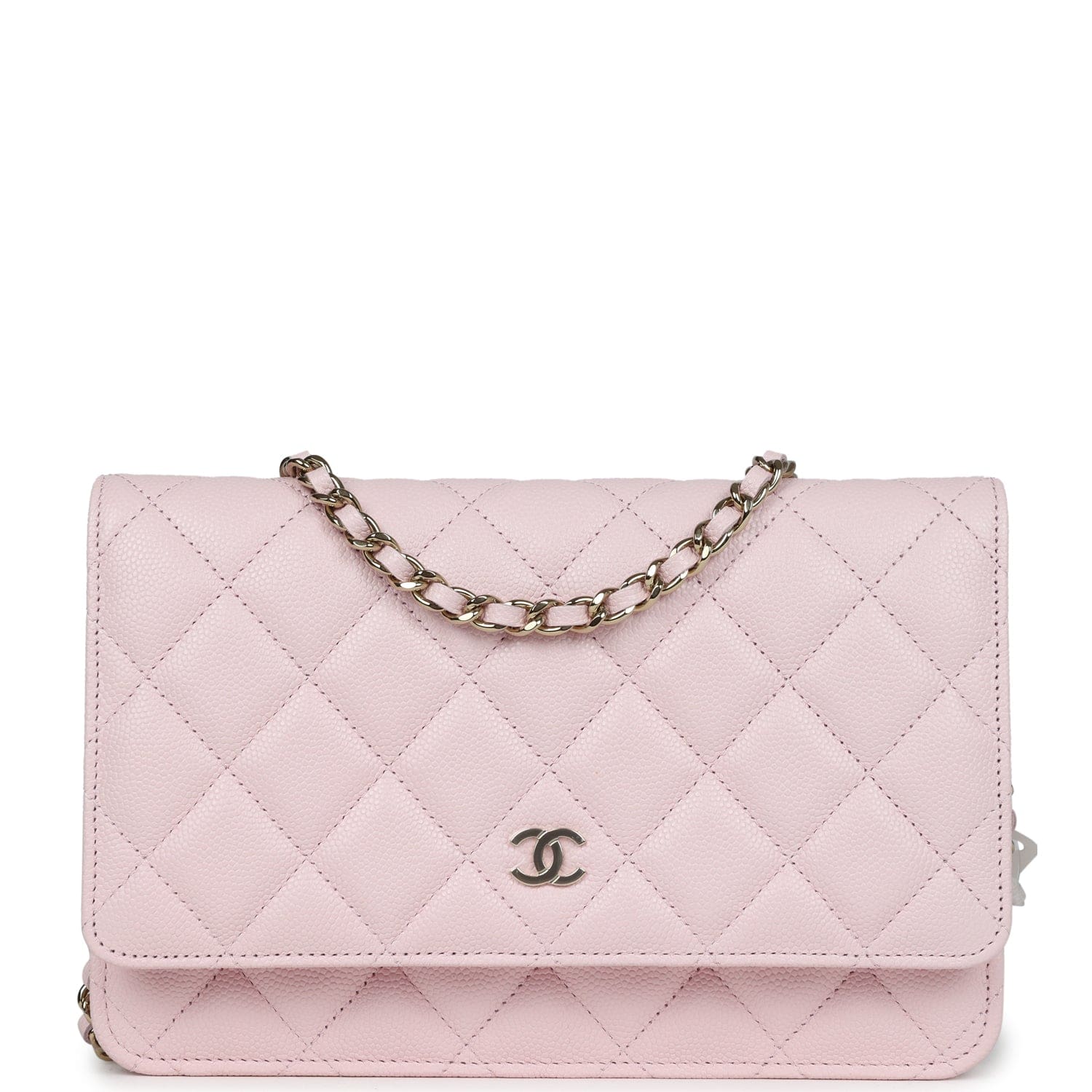 This wallet on chain is in Light Pink caviar with gold tone hardware and has a front flap with CC emblem, half moon back pocket and a long gold tone metal and light pink leather chain.