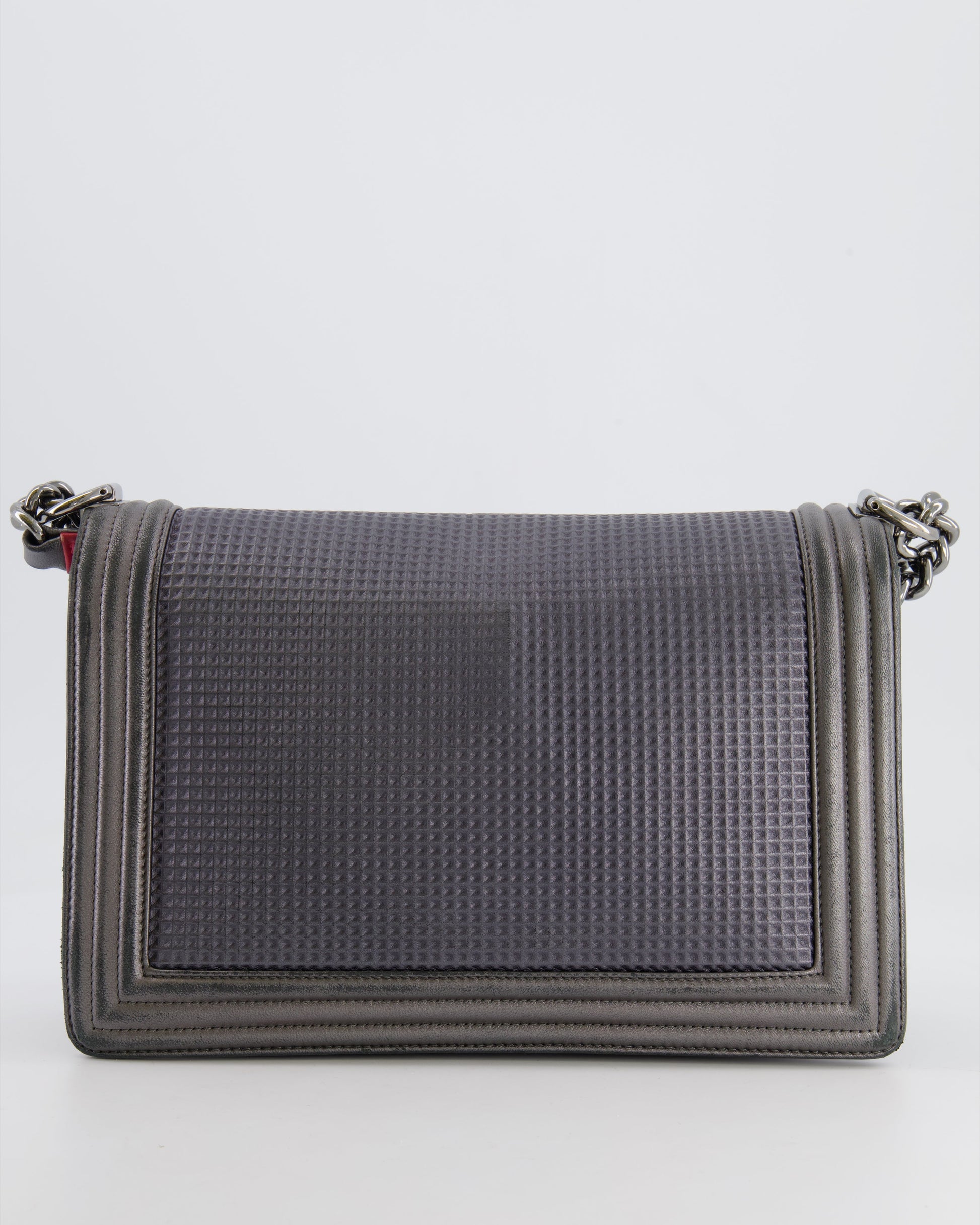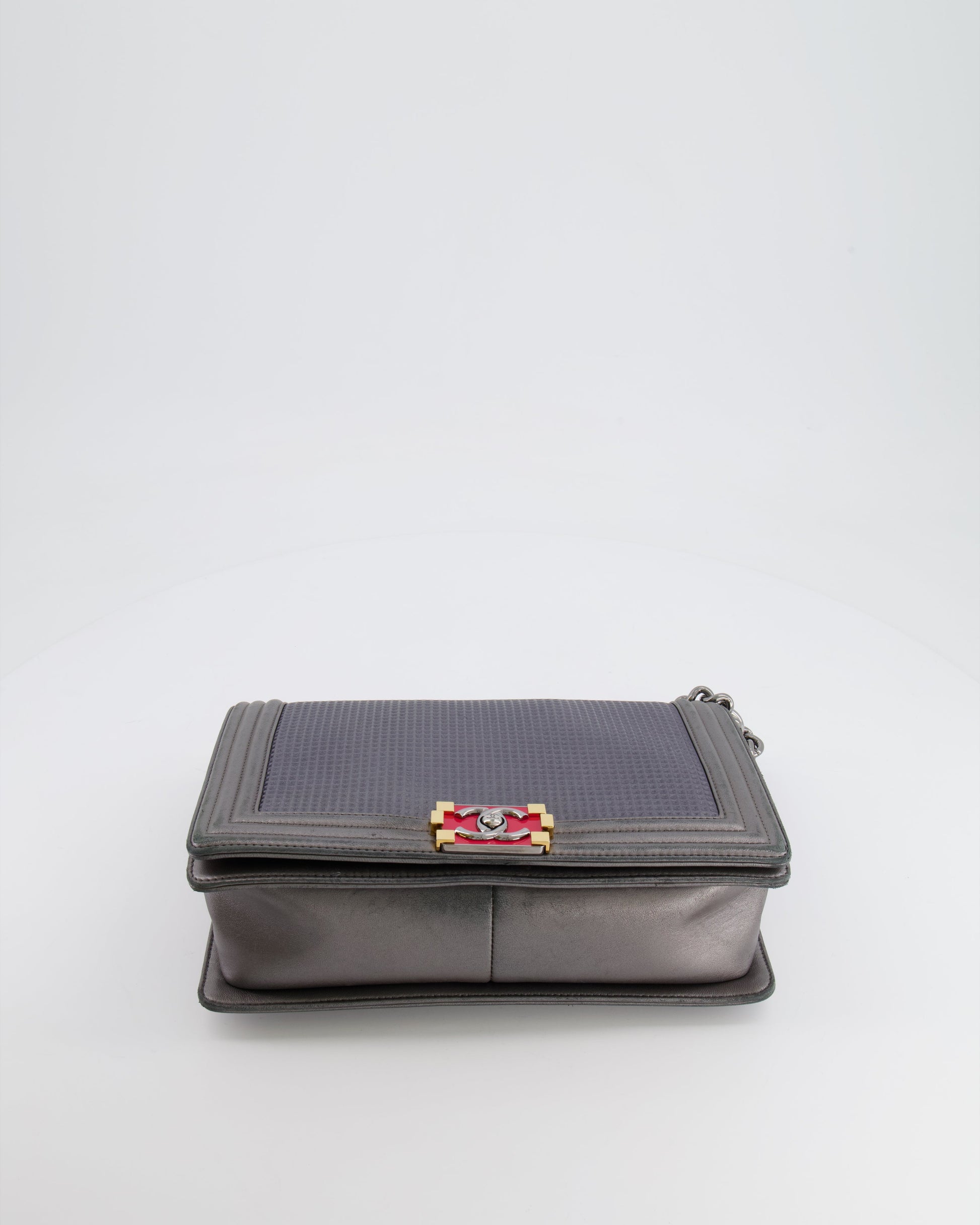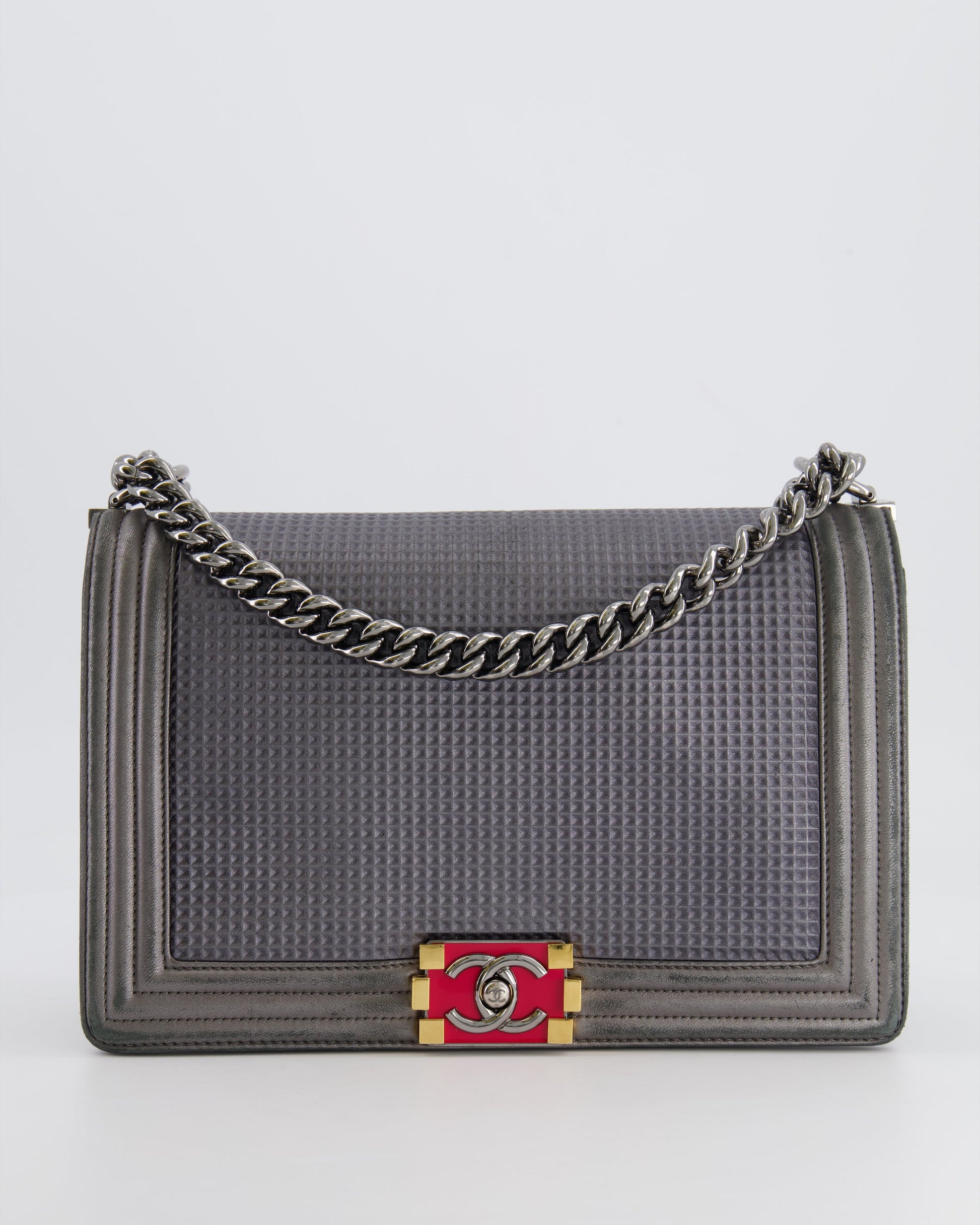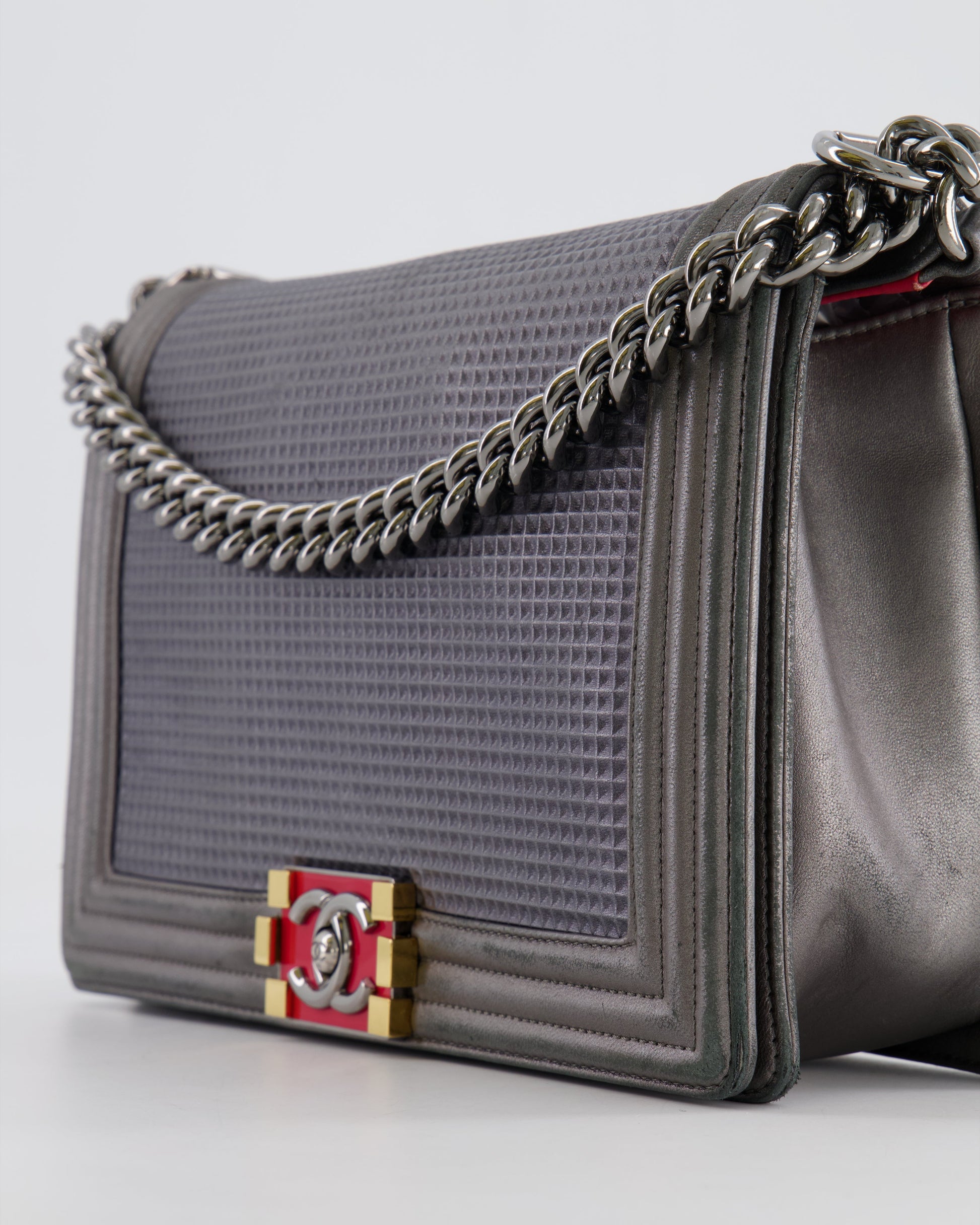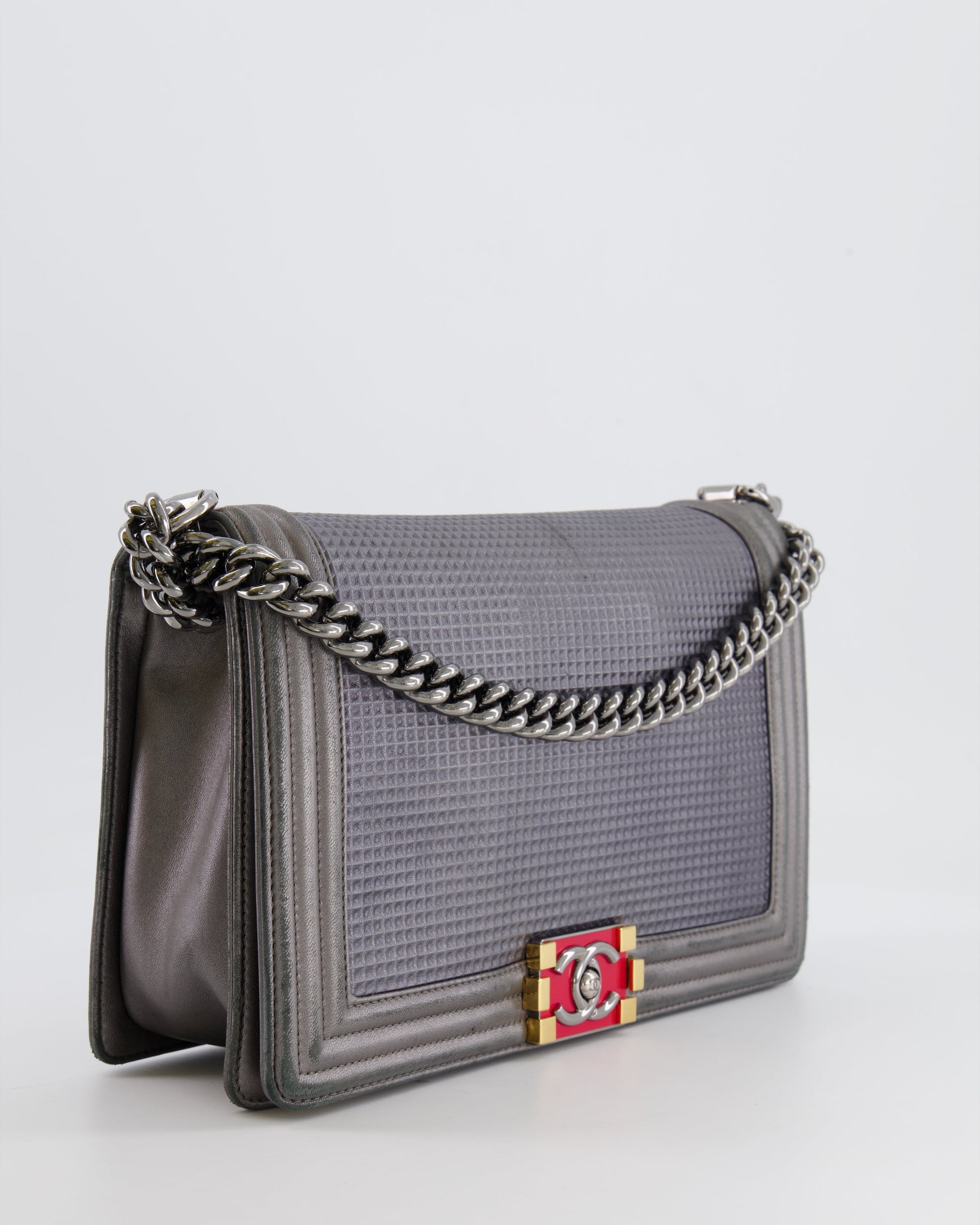 Chanel Grey Silver Medium Cube Calfskin Boy Bag with Silver, Gold and Red Hardware Hardware