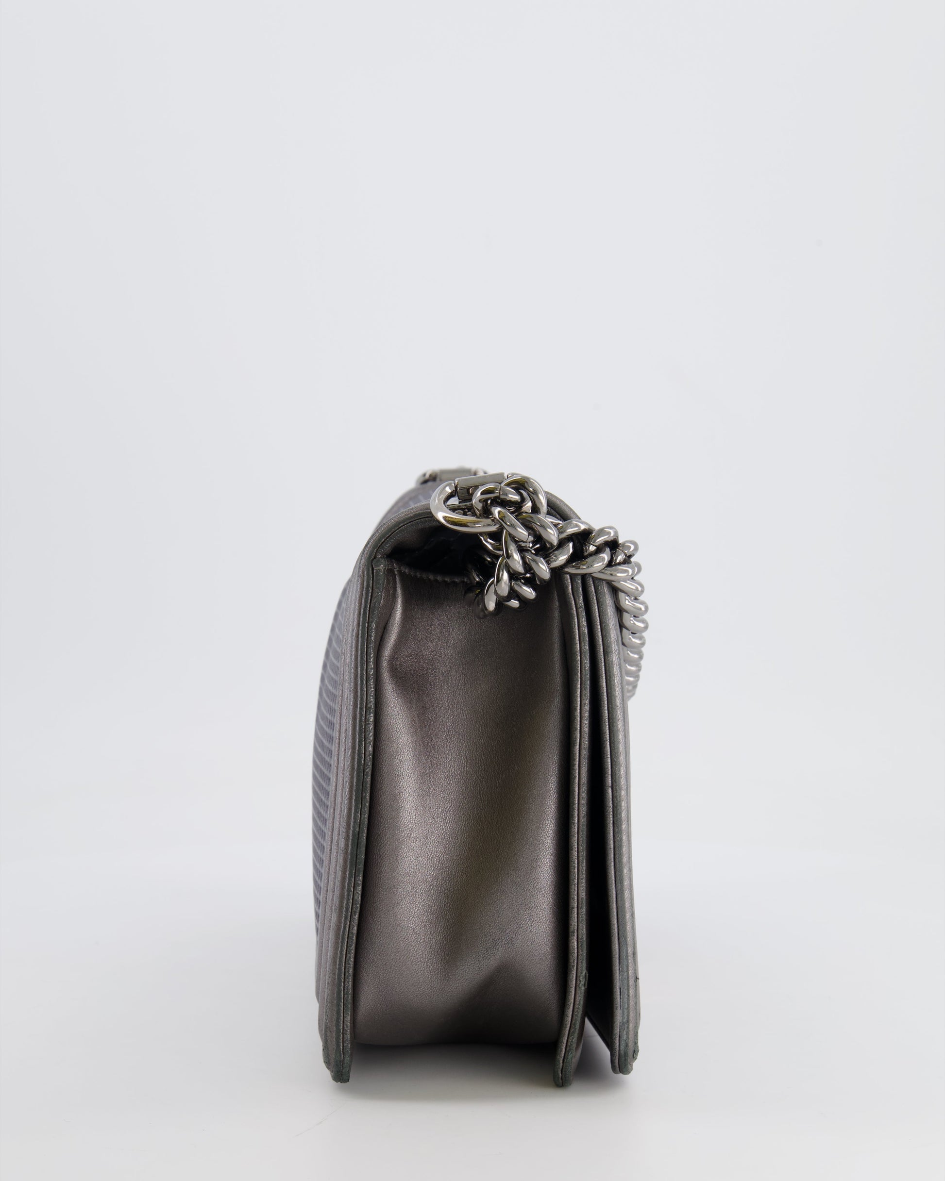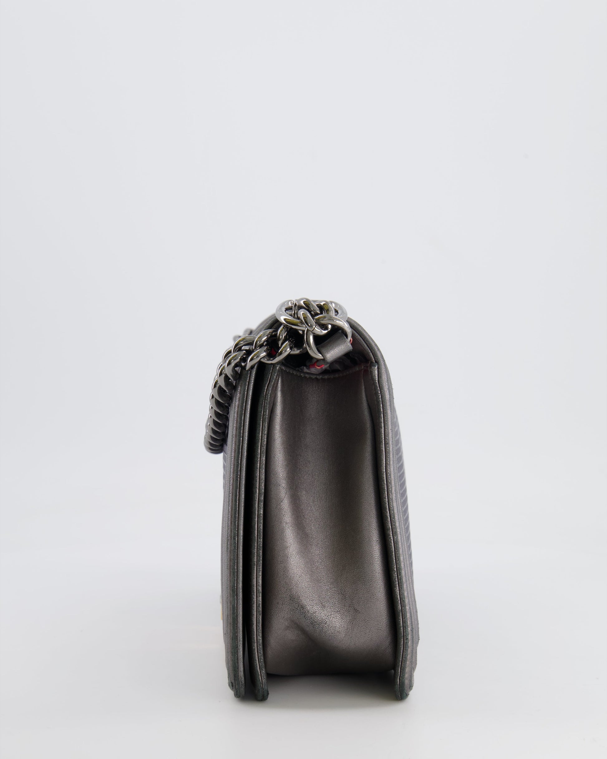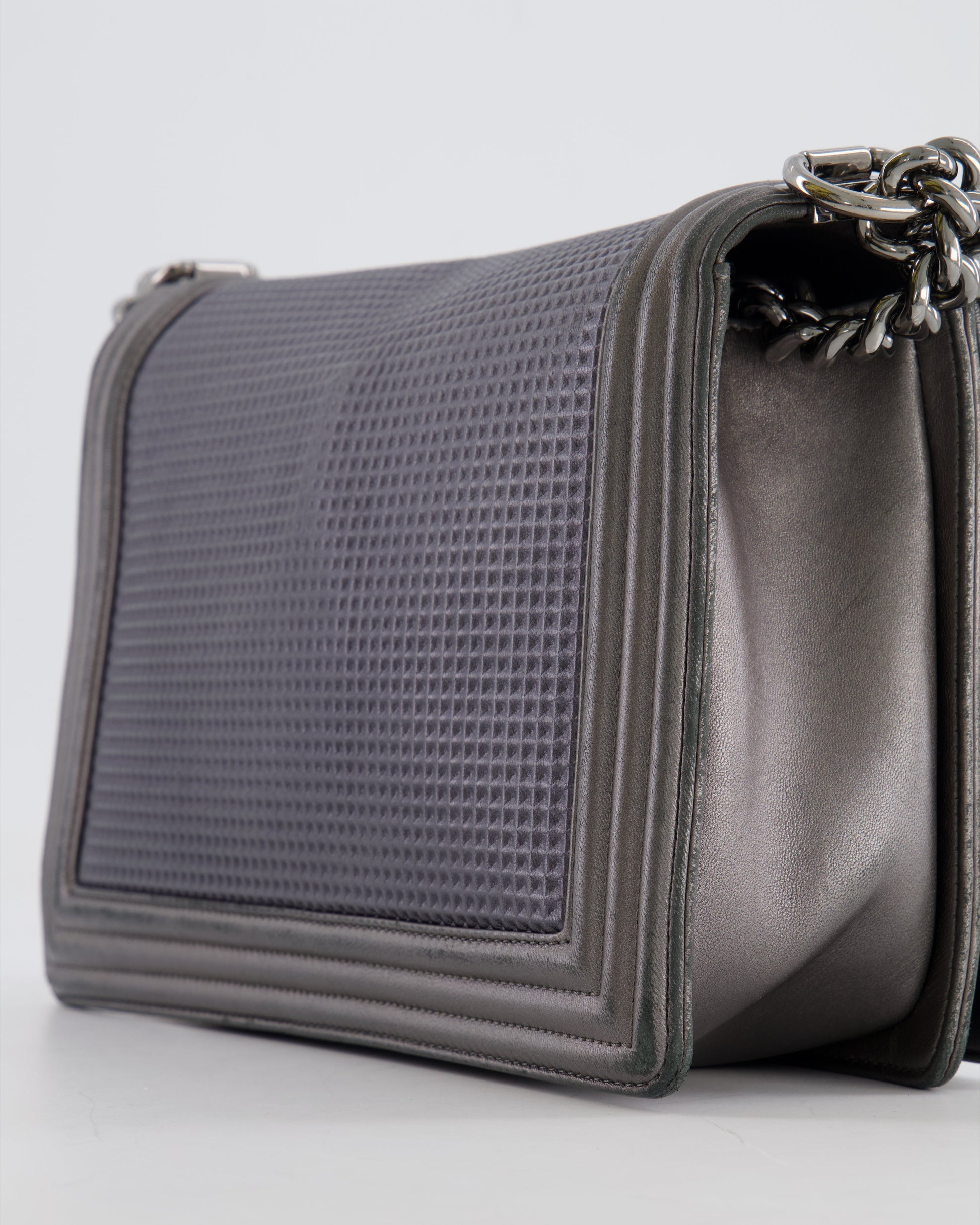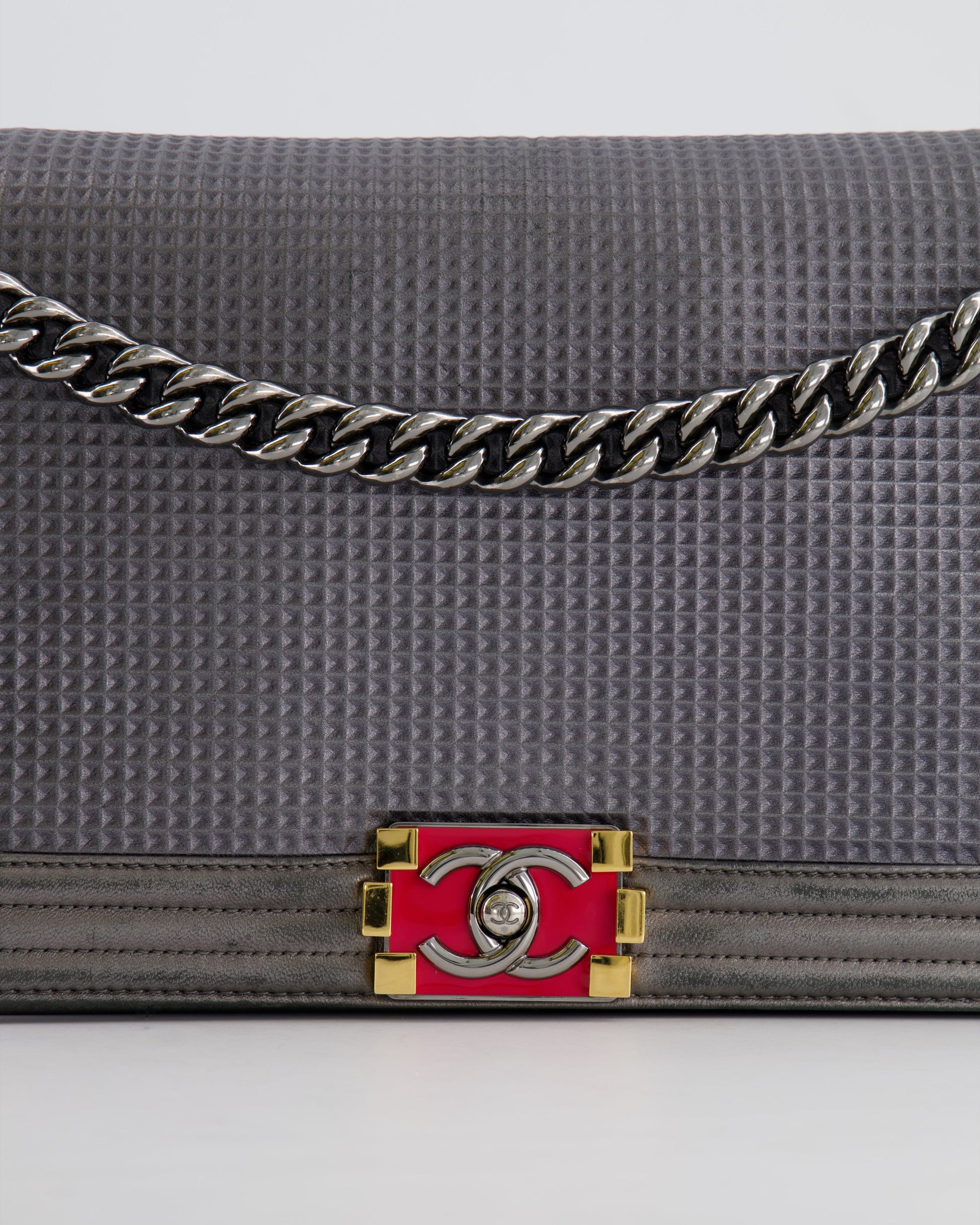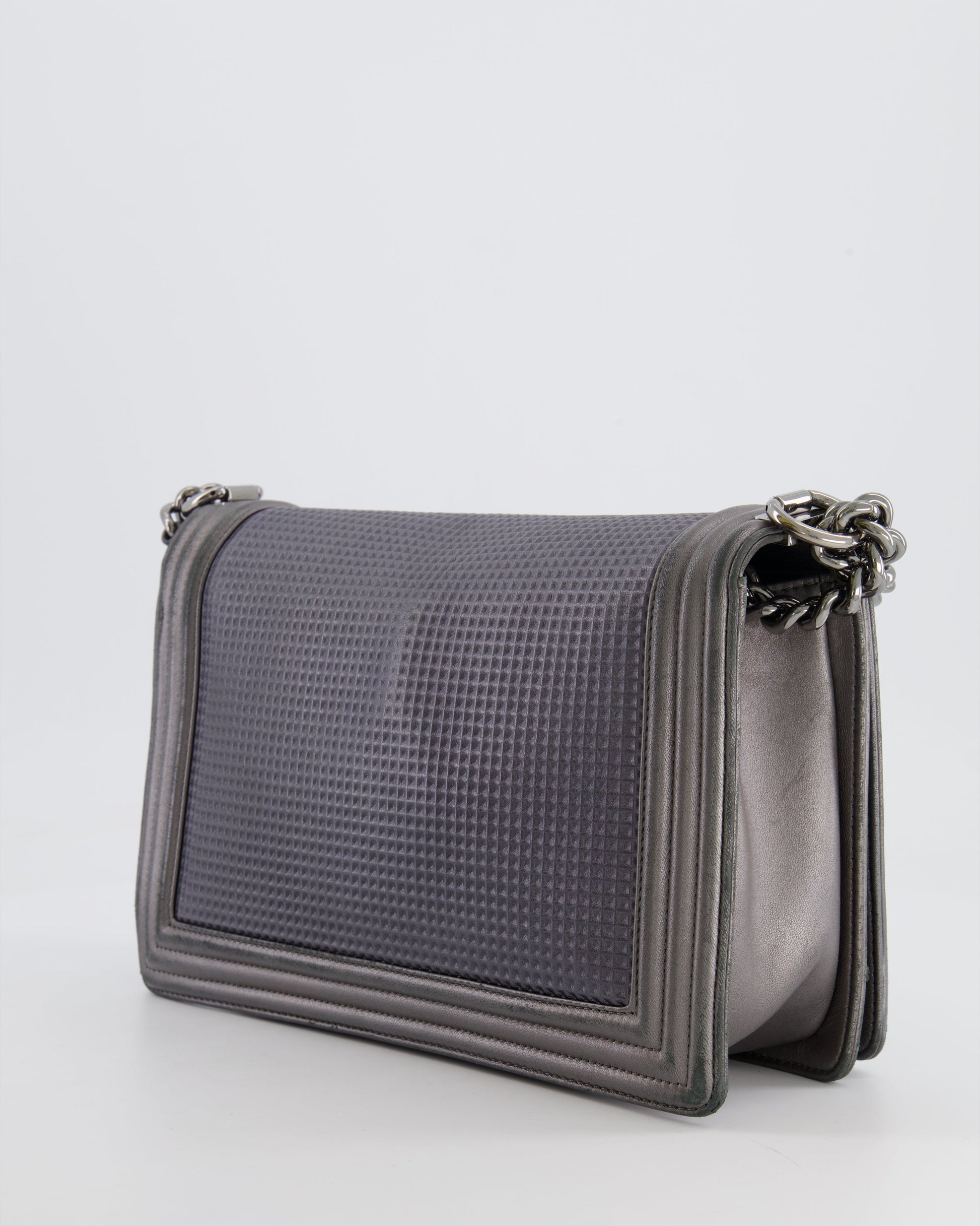 Chanel Grey Silver Medium Cube Calfskin Boy Bag with Silver, Gold and Red Hardware Hardware