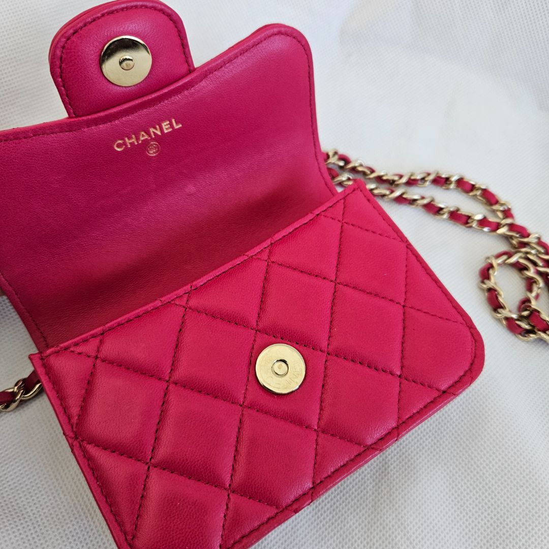 Chanel dark pink quilted lambskin top handle micro top handle flap bag with gold-tone hardware, strap is detachable