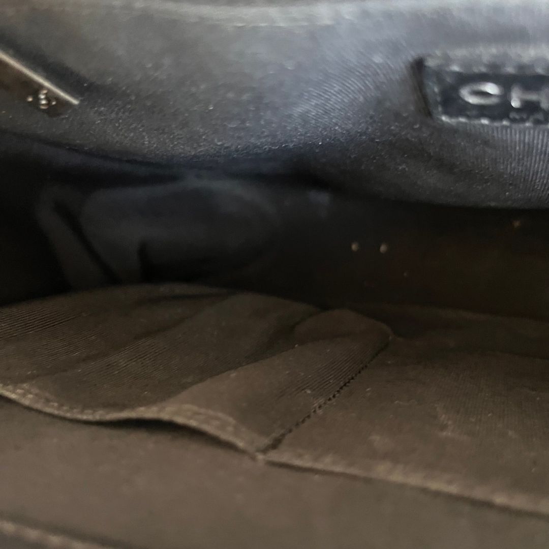 Chanel large two tone leather le boy bag in black and tan with gunmetal hardware, fabric lined interior with open pocket and one zip pocket.