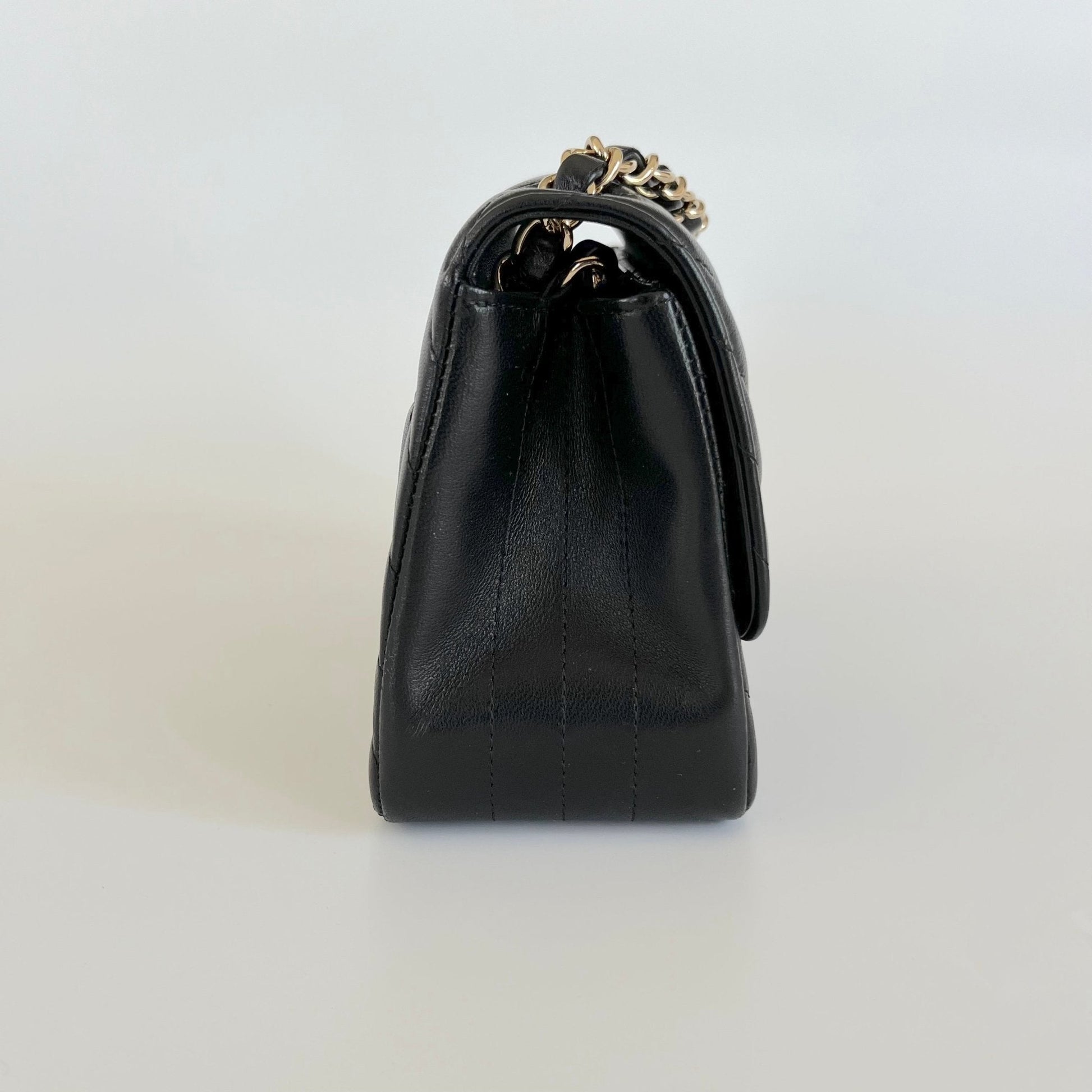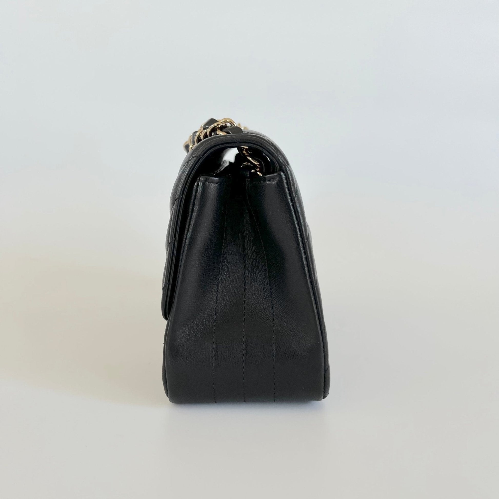 Chanel black chevron stitch square flap bag with light gold-tone hardware with turn-lock closure