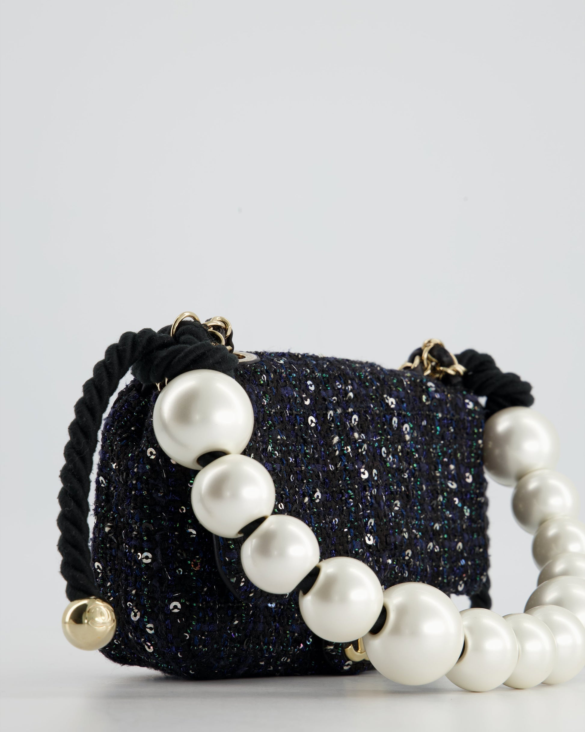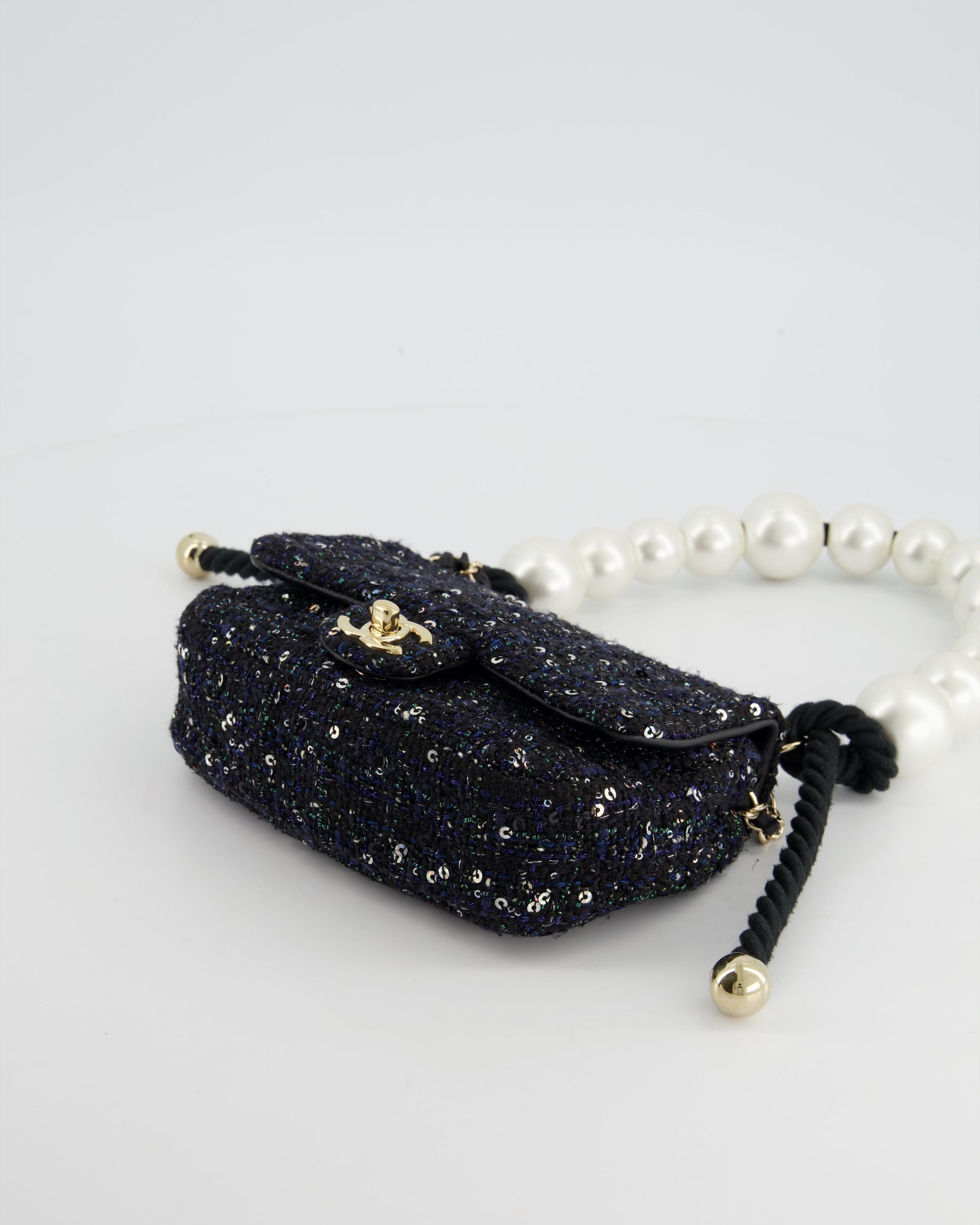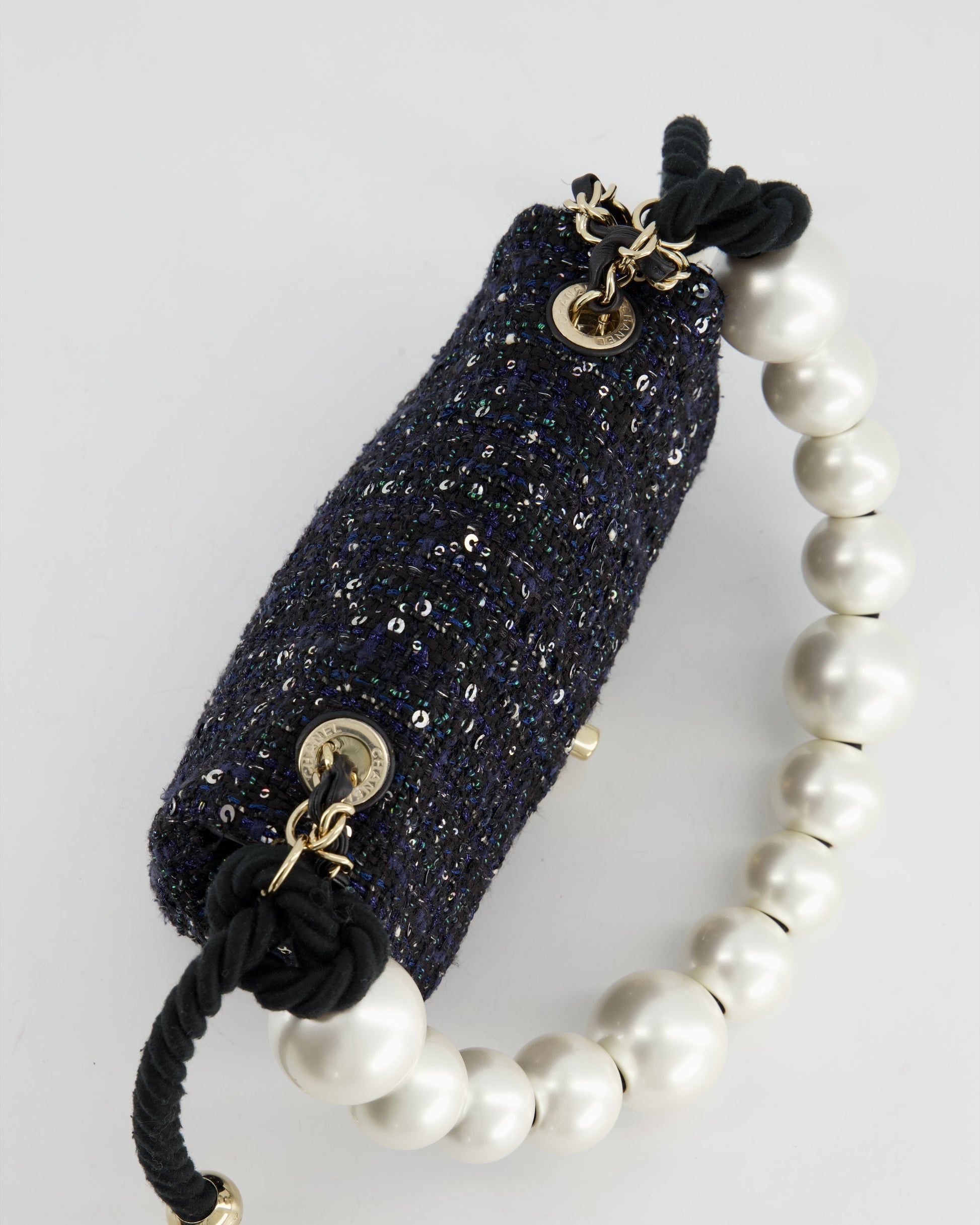 Chanel Navy Sequin Tweed Mini Rectangular Bag with Pearl Rope Handle and Champagne Gold Hardware