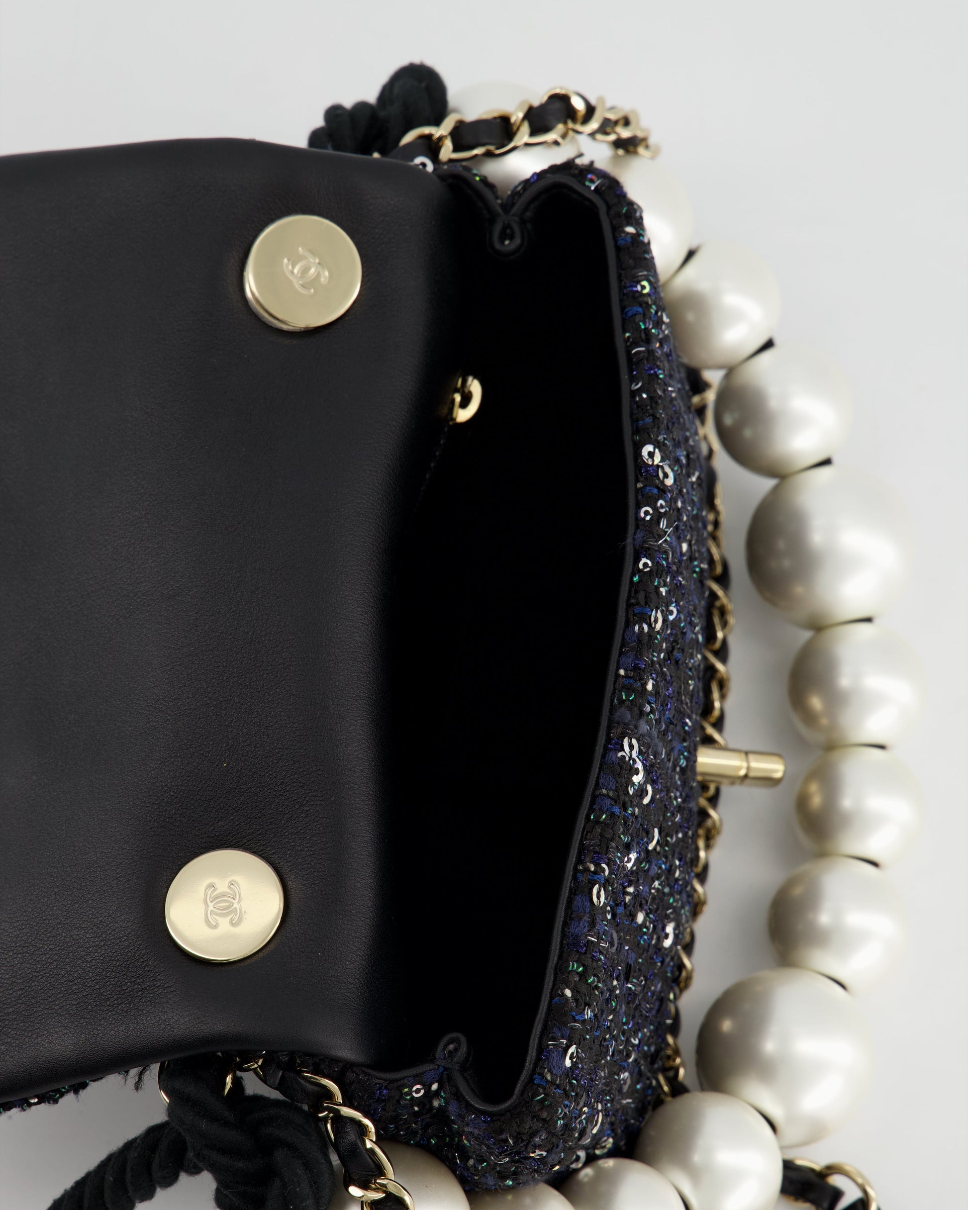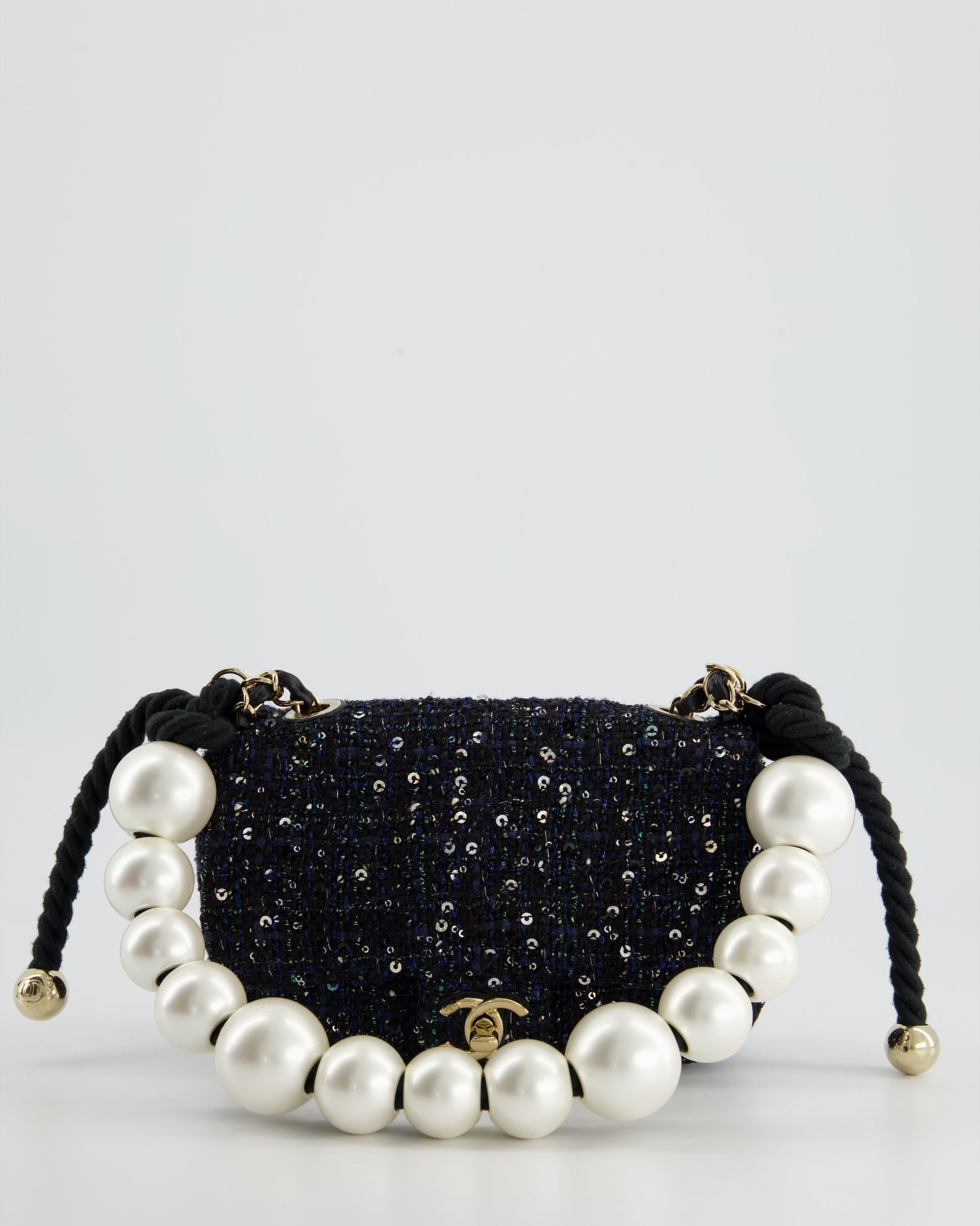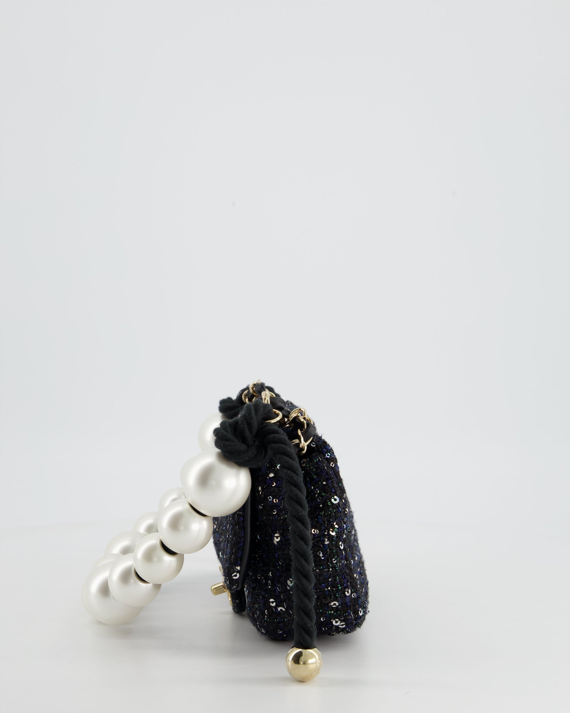Chanel Navy Sequin Tweed Mini Rectangular Bag with Pearl Rope Handle and Champagne Gold Hardware