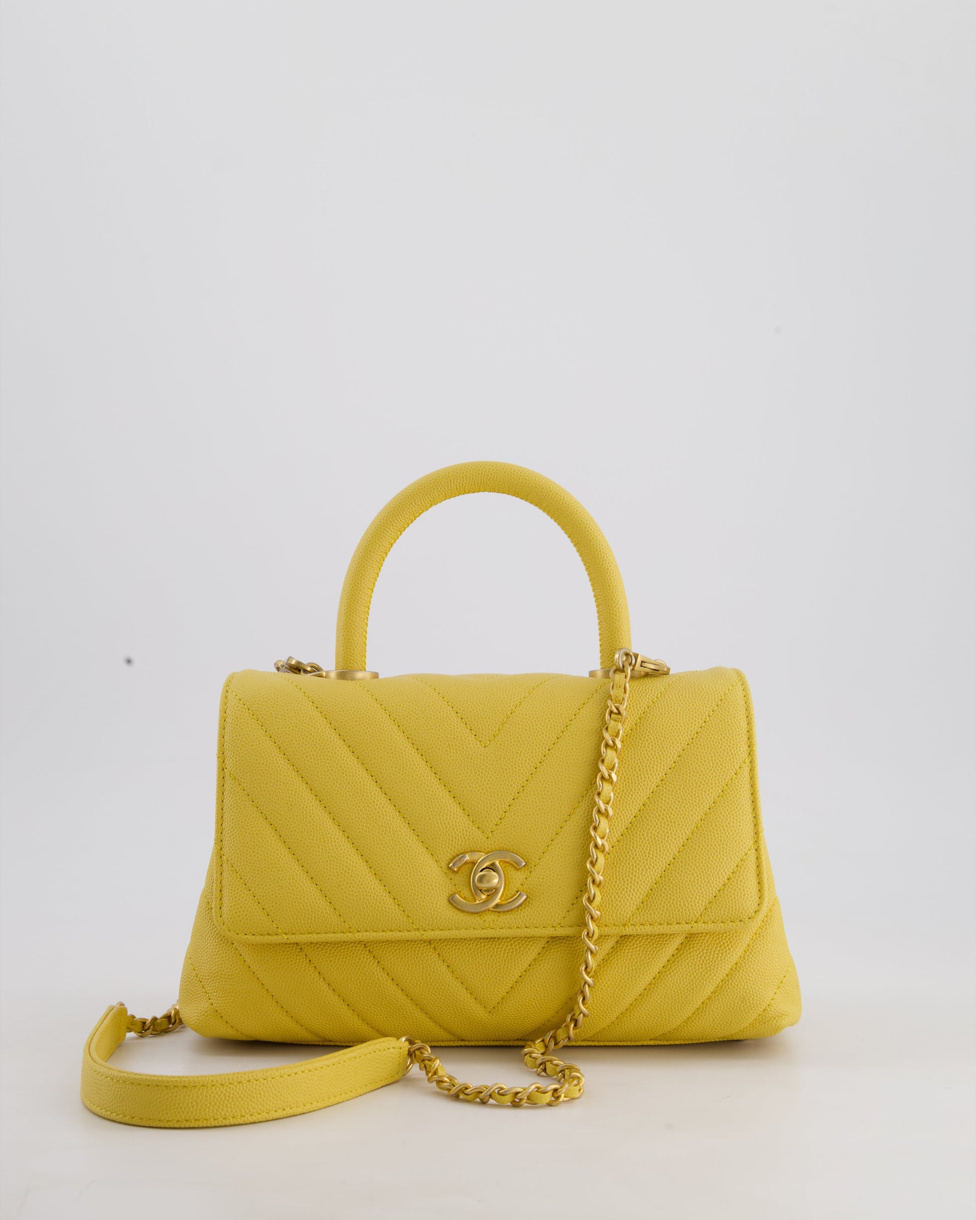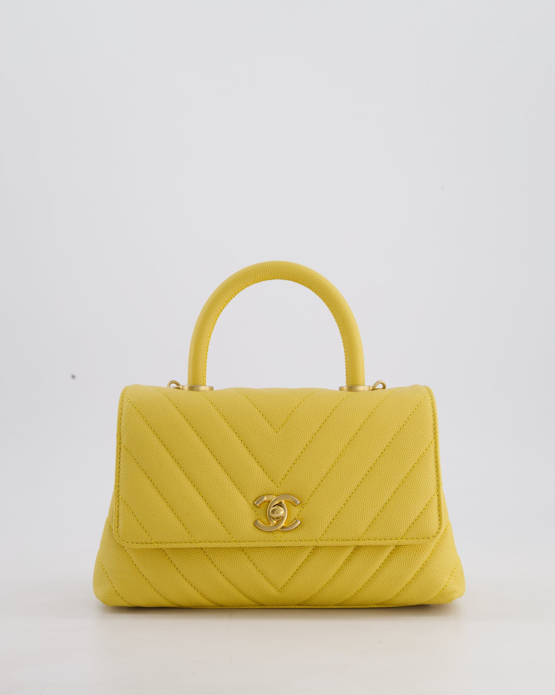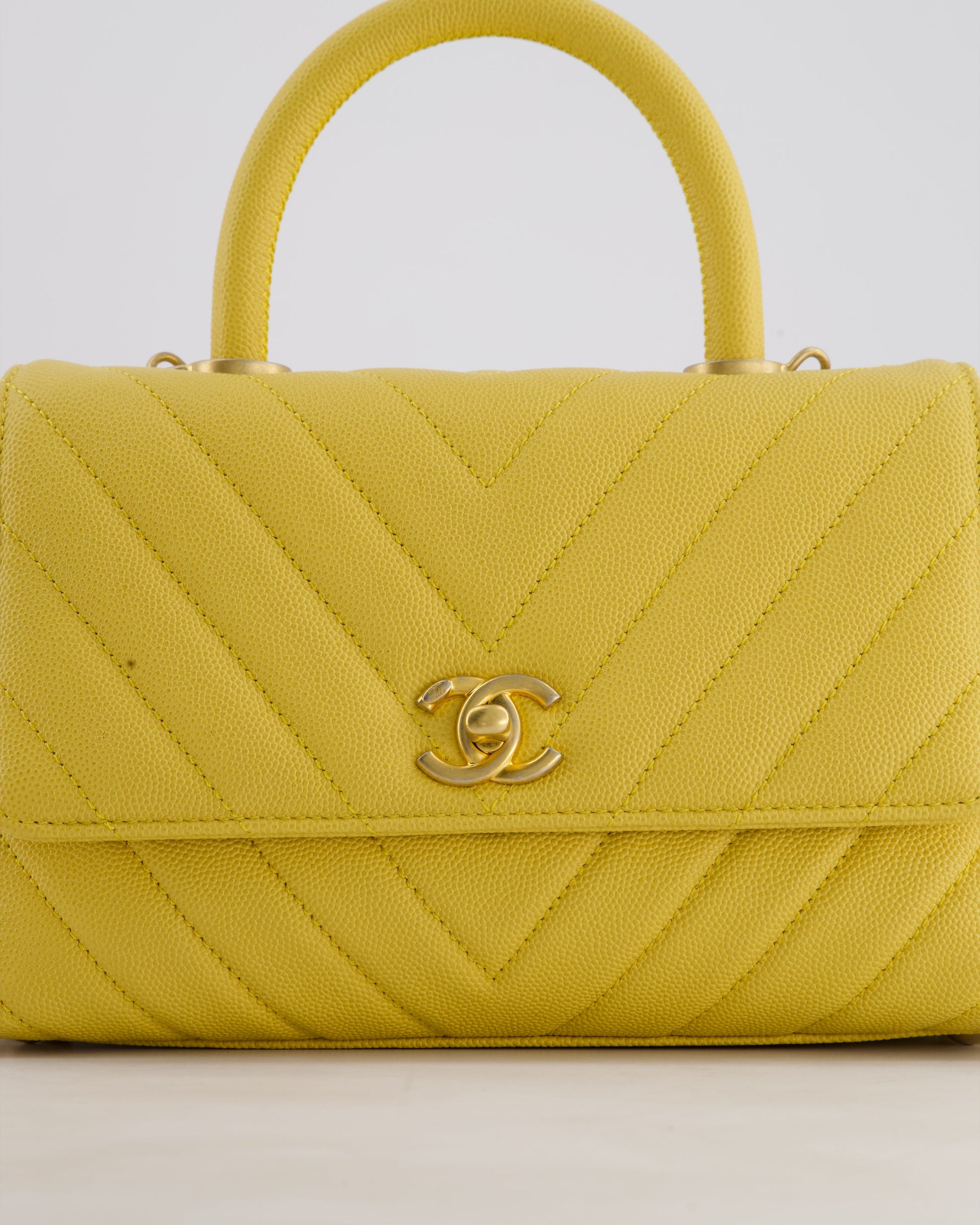 Chanel Small Mustard Yellow Coco Flap Top Handle Bag in Caviar Chevron Leather with Brushed Gold Hardware