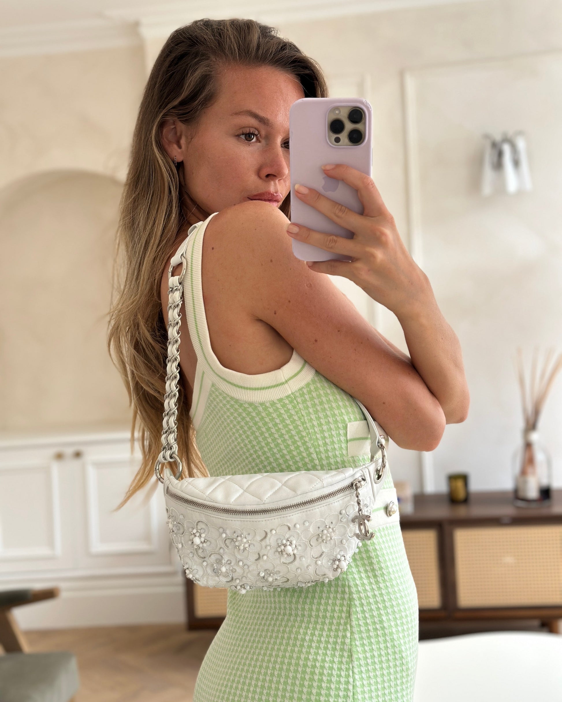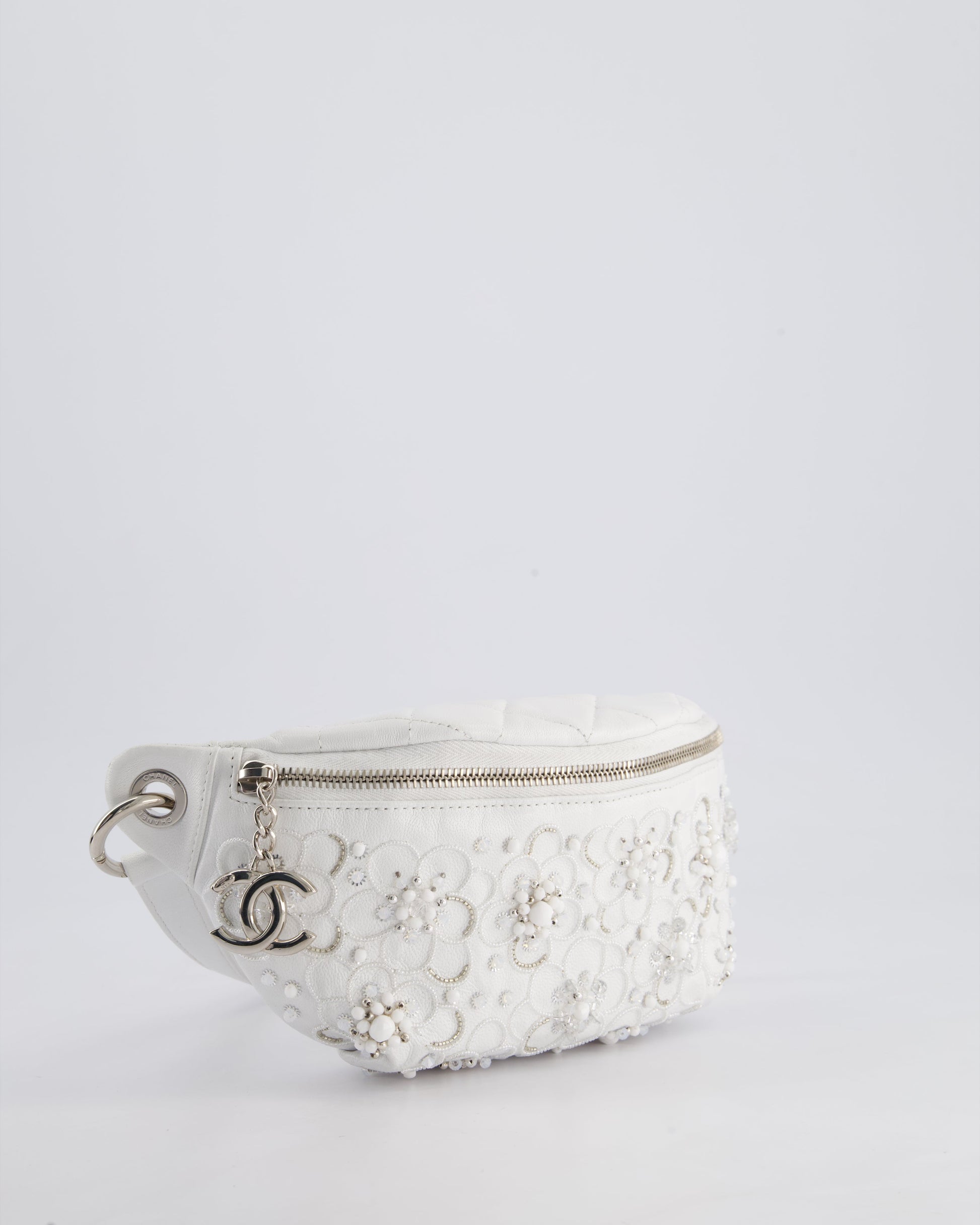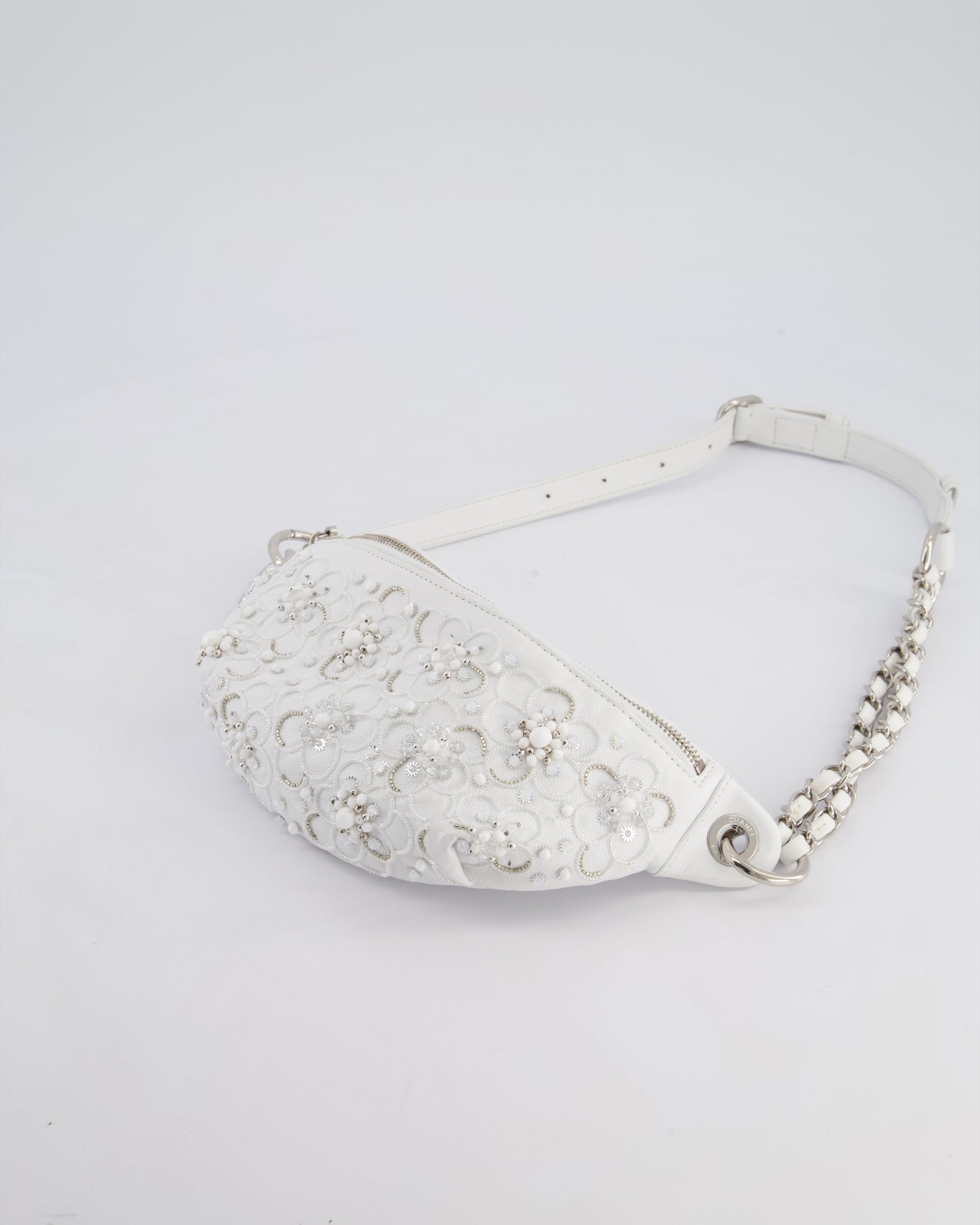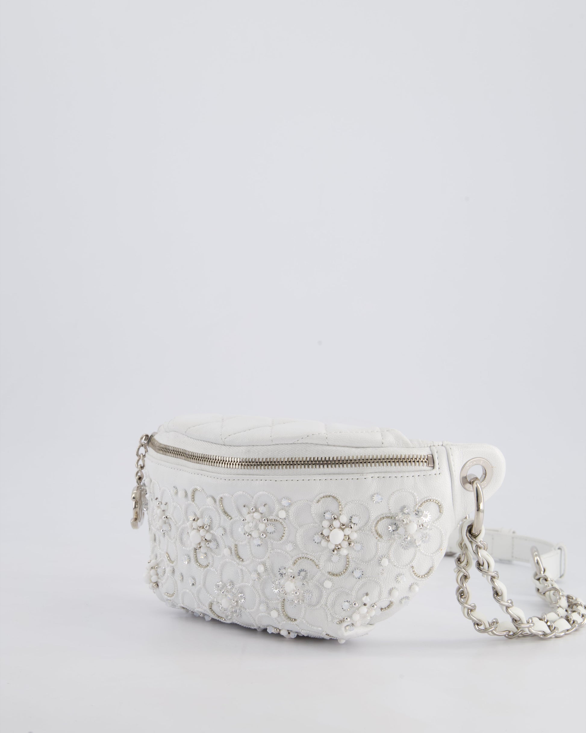 Chanel White Lambskin Leather Bum Bag with Silver Crystal Bead Embellishments and Silver Hardware RRP £4,660