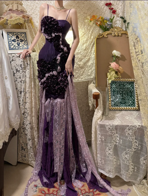Charming Purple Heavy Strap Floral Lace Mermaid Prom Dress P3752