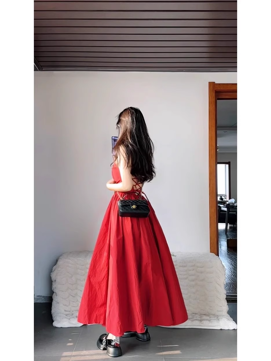 Chic A Line Spaghetti Straps Red Backless Ruffles Long Prom Dresses Birthday Outfits SD510