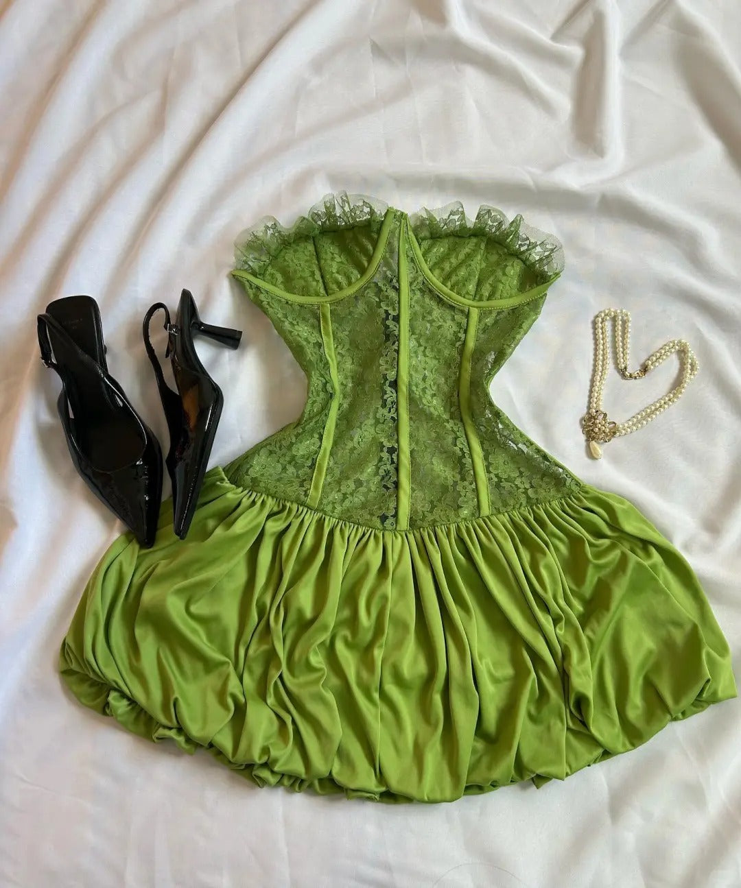 Chic Green Herringbone Lace Tube Top Bud Skirt Mini Homecoming Dress P3149