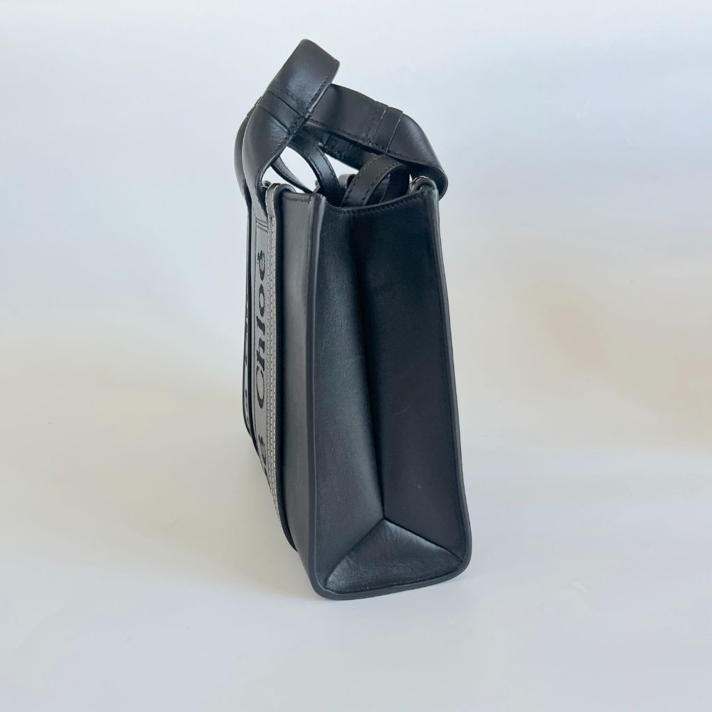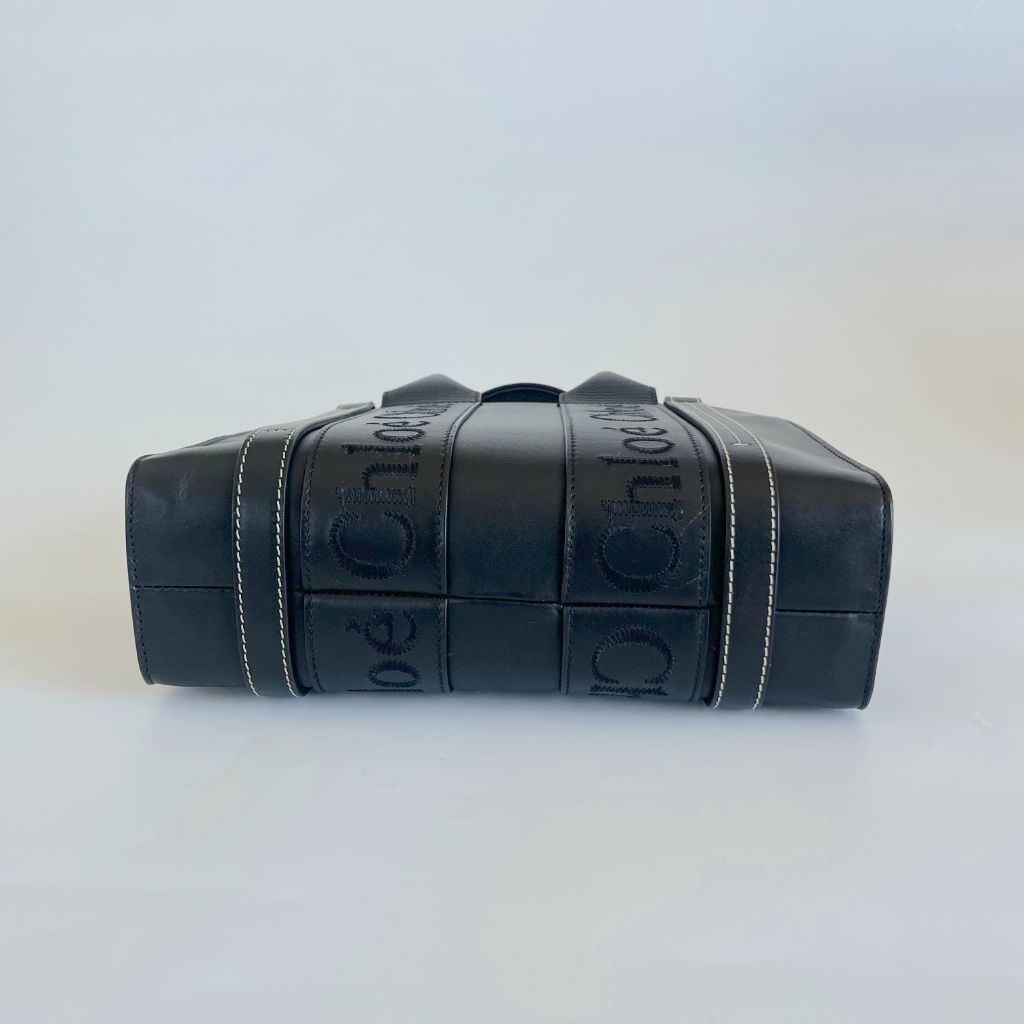 Chloè Small Woody Tote bag in black smooth calfskin with contrast stitching. Spacious linen-lined internal comportament with aflat pocket. Has two top handles and a removable /adjustable shoulder strap