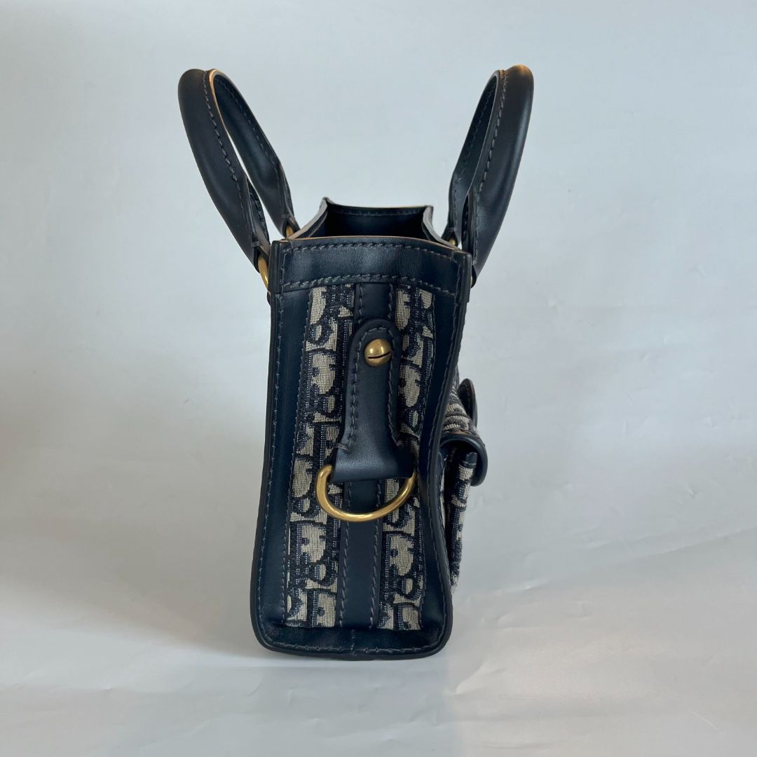 Dior Oblique Mini Tote bag, crafted of embroidered canvas in navy blue. The bag features navy blue leather rolled top handles, an adjustable shoulder strap, a front flap pocket and aged gold hardware. This bag opens to a fabric interior with patch pockets
