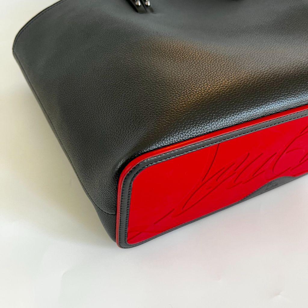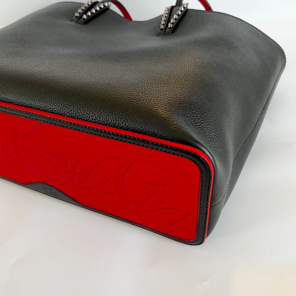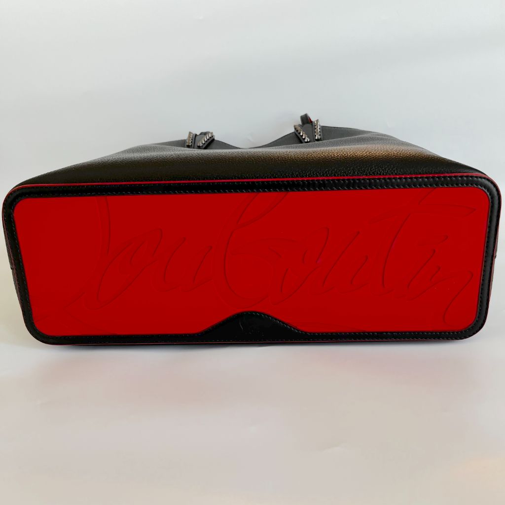 Christian Louboutin black textured leather studded tote bag lined in red and adorned with silver spikes comes with removable tone-on-tone leather case and red fabric open pouch that fits inside the bag.