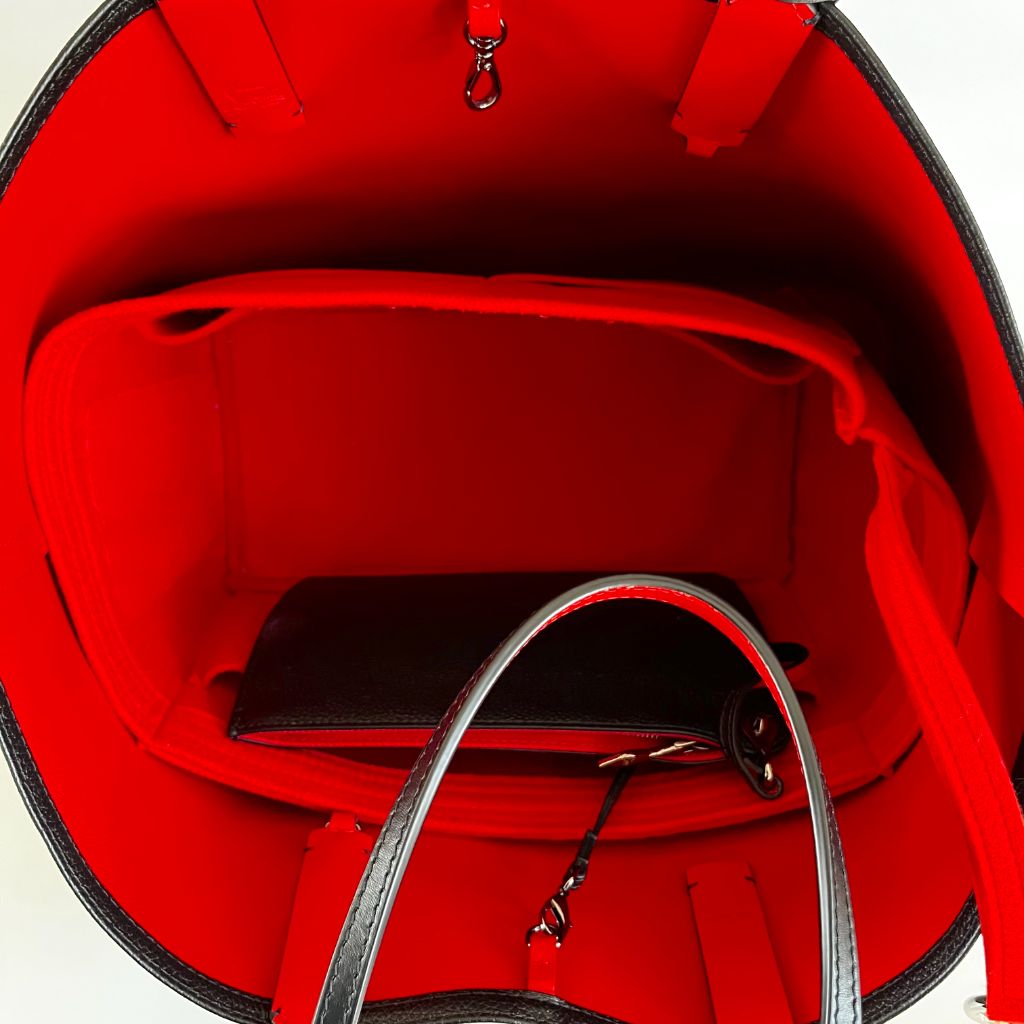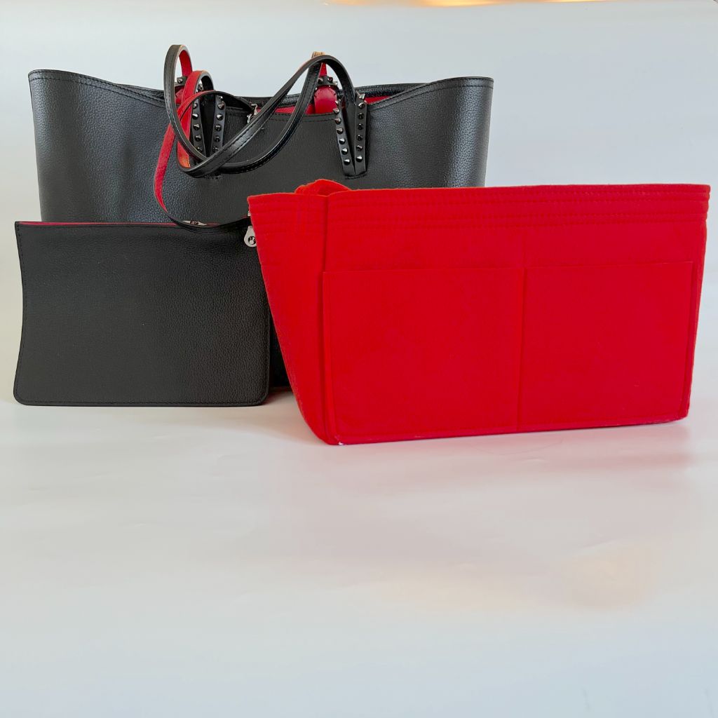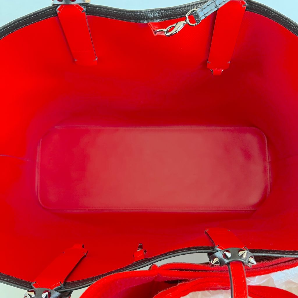Christian Louboutin black textured leather studded tote bag lined in red and adorned with silver spikes comes with removable tone-on-tone leather case and red fabric open pouch that fits inside the bag.