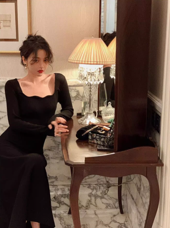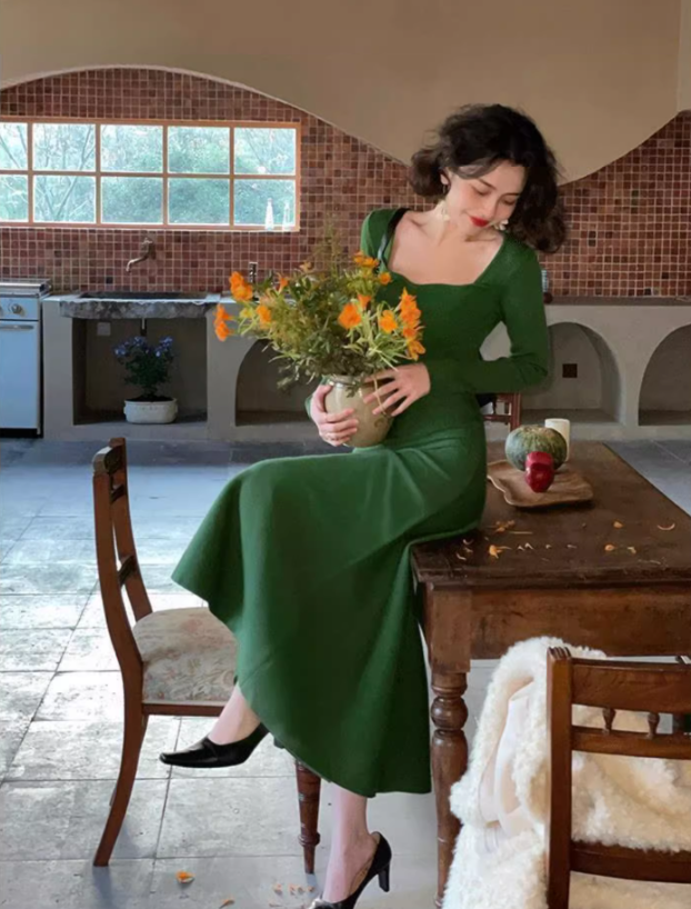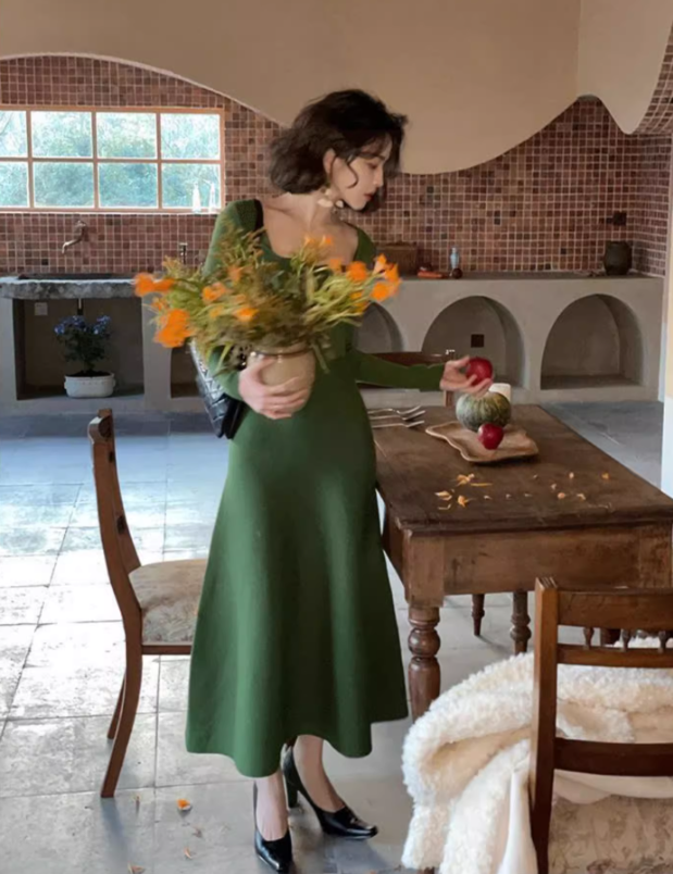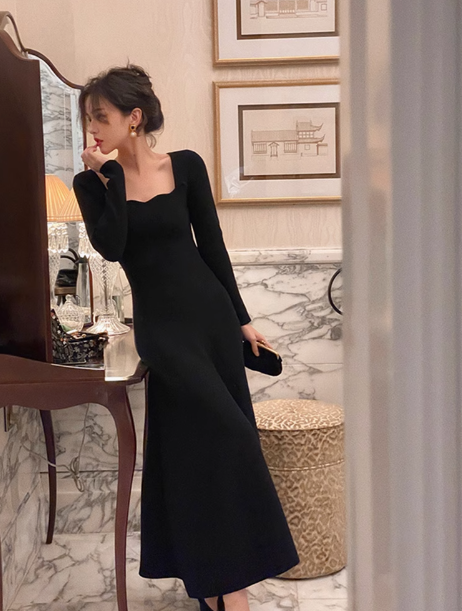 French retro square collar wave edge long sleeves mid-length knitted women's dress ED0139
