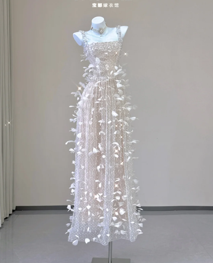 Classy A Line Square Neckline Champagne Tulle Long Prom Dresses P0003
