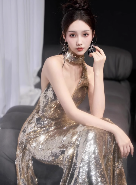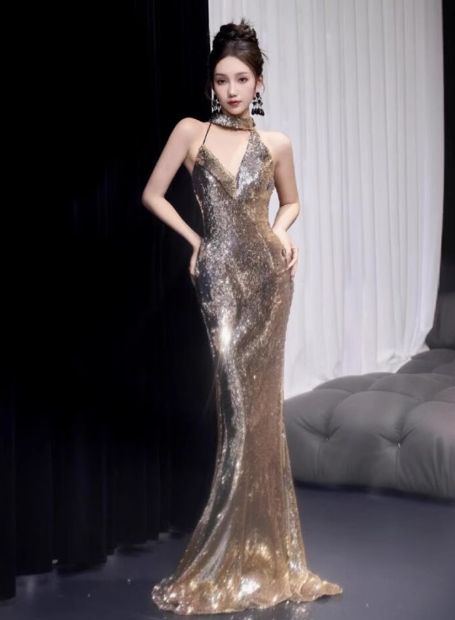 Classy Mermaid Gold Sequin Long Prom Dresses Formal Gown Summer Wedding Guest Dresses Wedding Guest Outfit W0730