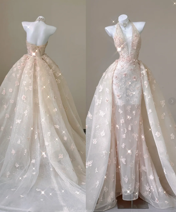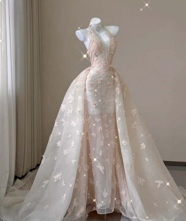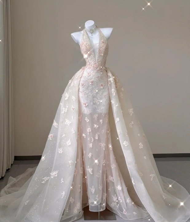 Classy Mermaid Halter Pink Lace Sleeveless Evening Dress Long Prom Dresses P0013