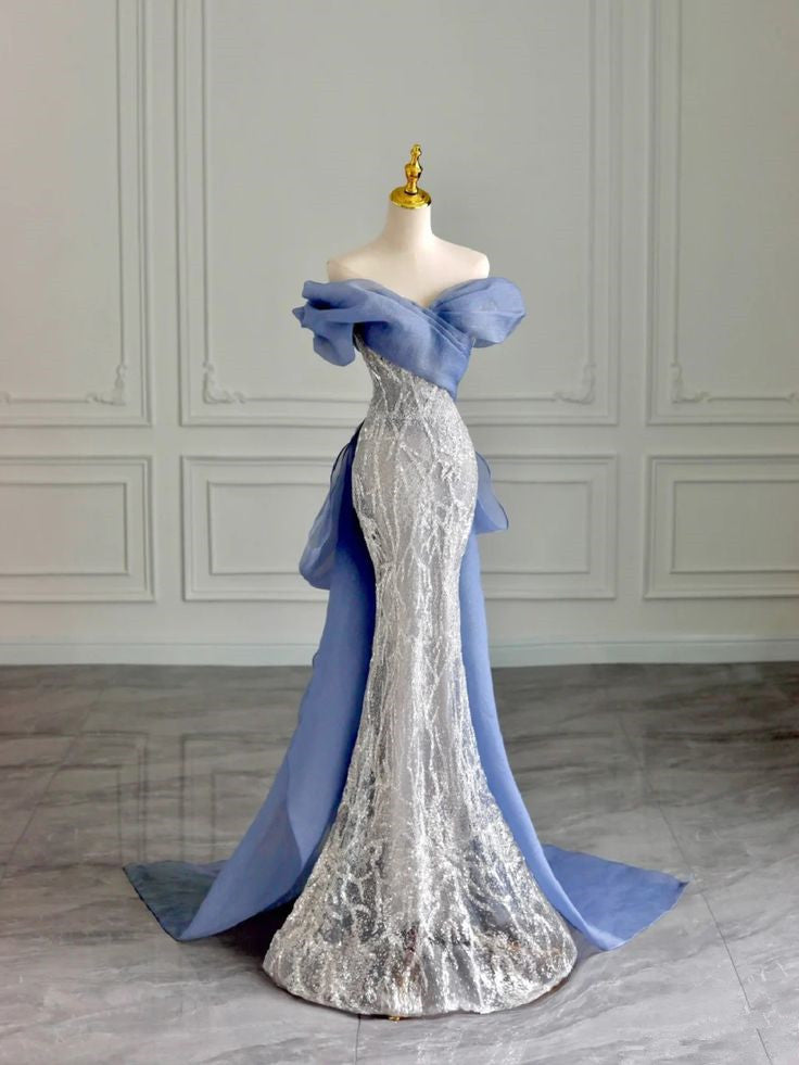 Classy Mermaid Off The Shoulder Blue Sequin Long Party Dress Prom Dresses SD1826