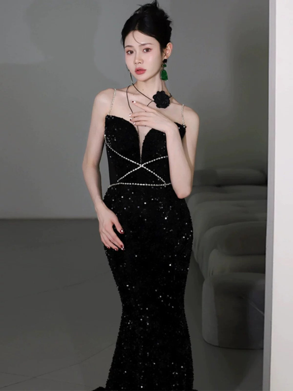 Classy Mermaid Spaghetti Straps Black Sequin Long Evening Gowns Prom Dress SD2768