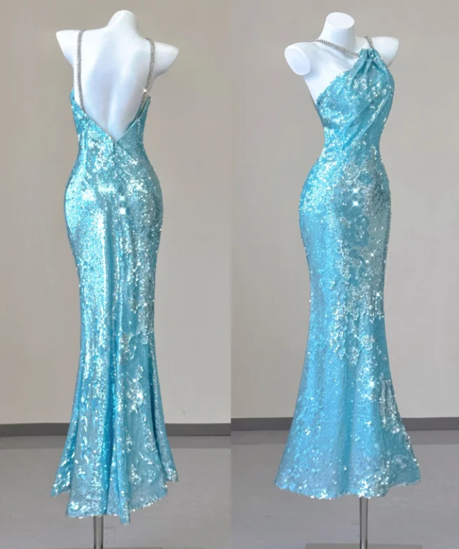 Classy Mermaid Spaghetti Straps Blue Sequin Evening Dress Long Prom Dresses P0005