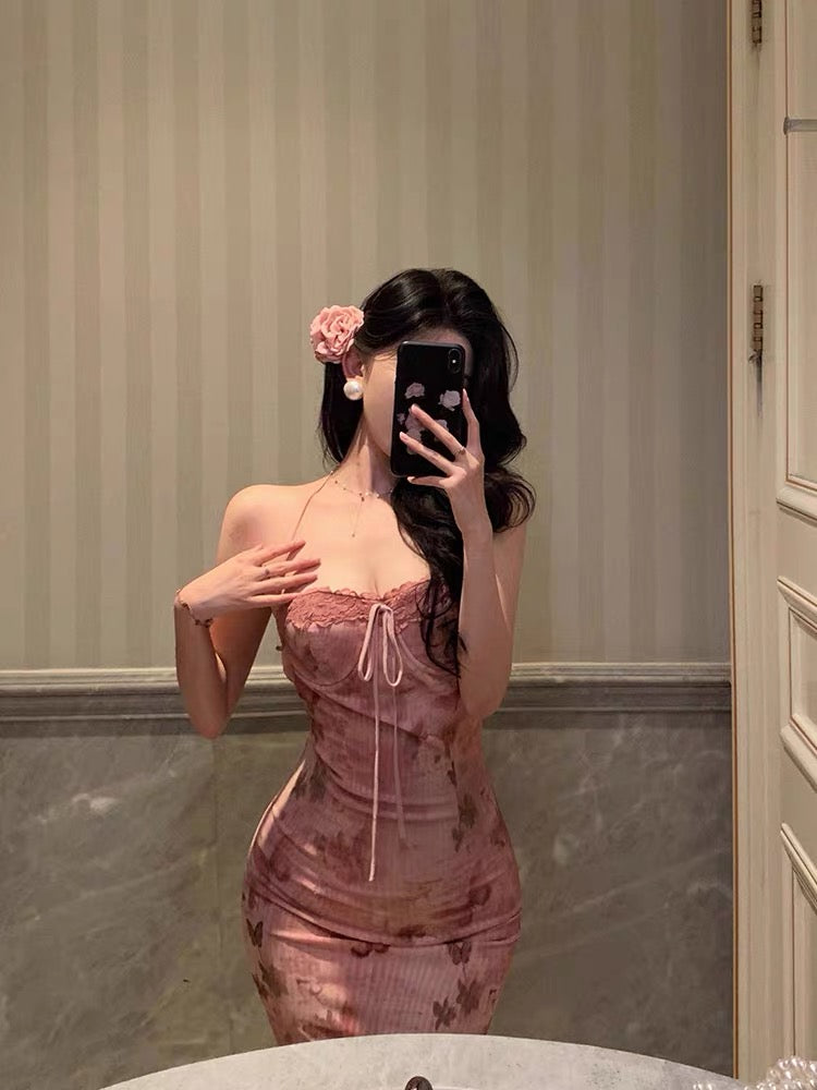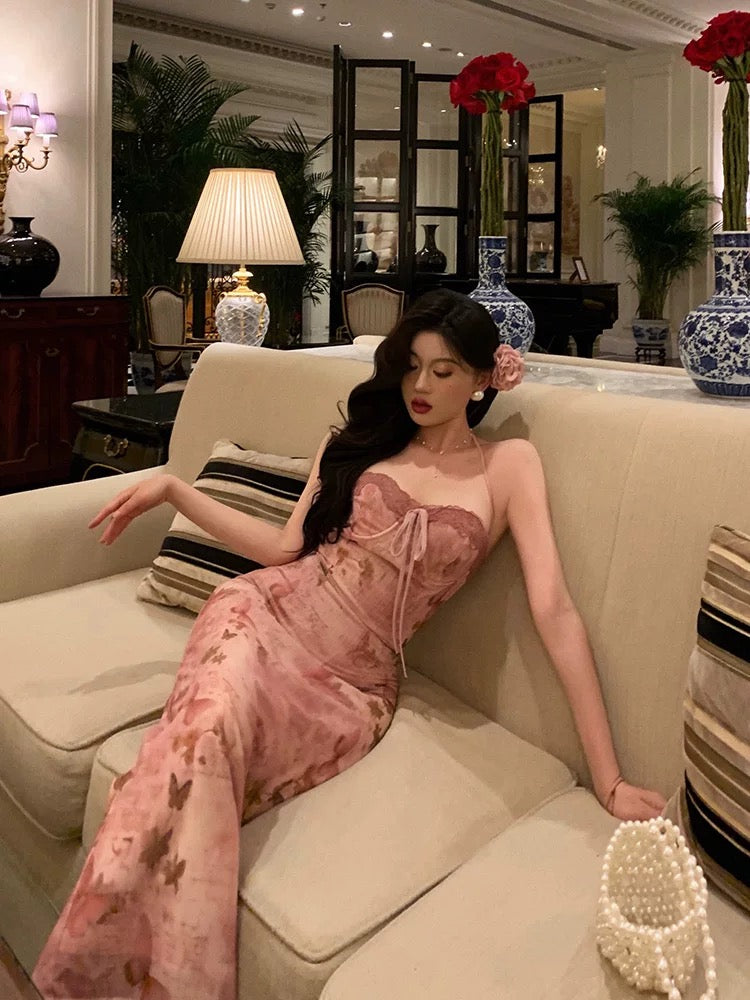 Classy Mermaid Spaghetti Straps Sleeveless Pink Floral Prom Dresses Birthday Outfits SD693