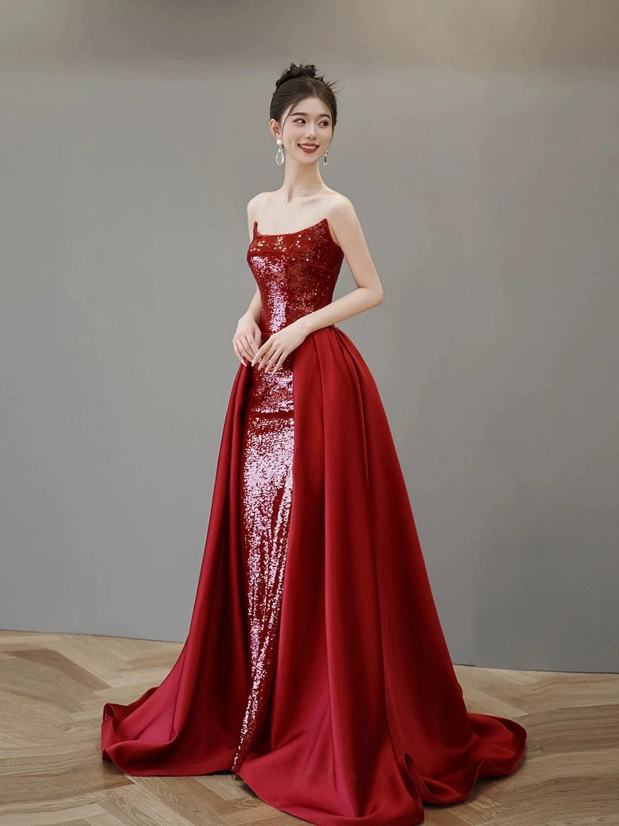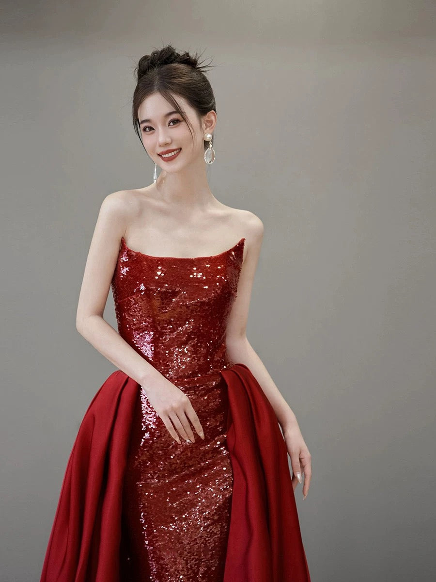 Classy Mermaid Strapless Red Sequin Long Evening Dress Long Prom Dresses H2879