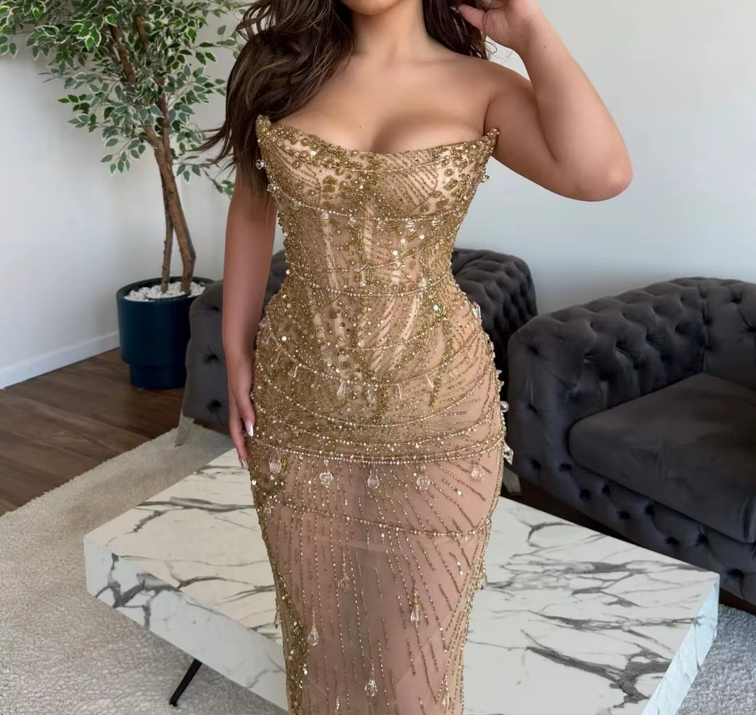 Classy Mermaid Strapless Tulle Pink Long Evening Dress Prom Dresses With Beads SD2073