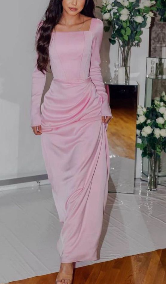 Classy Pink Square Neckline Evening Dress with Long Sleeves fg7554
