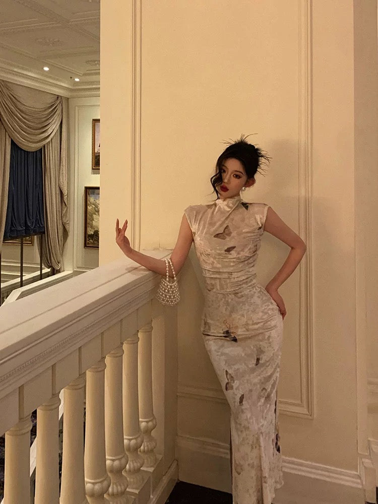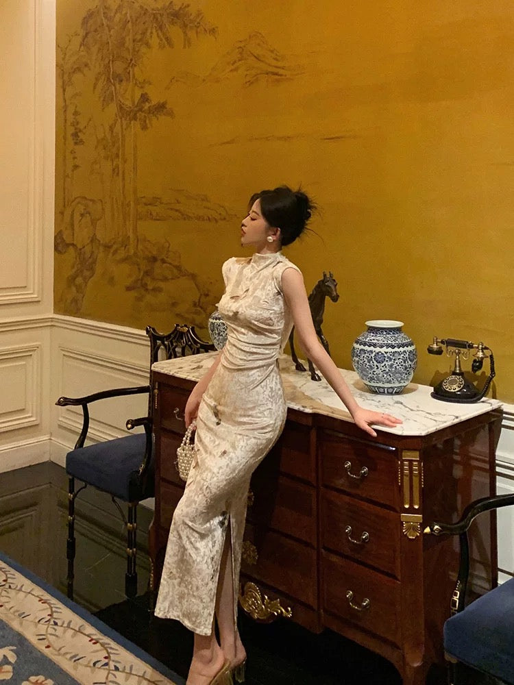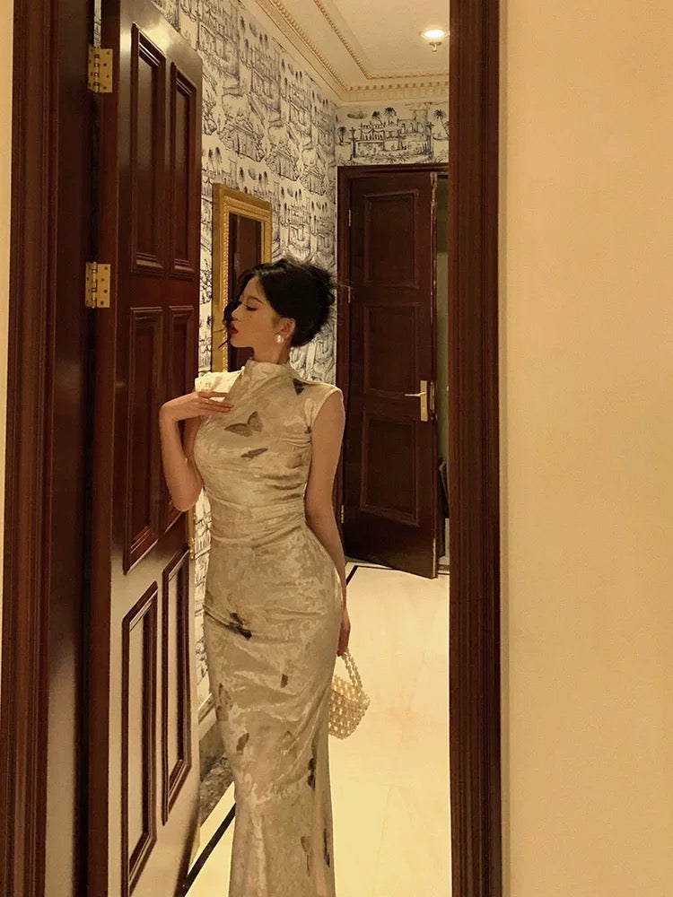 Classy Sheath High Neckline Velvet Flora Prom Dresses Birthday Outfits Evening Gown SD1090