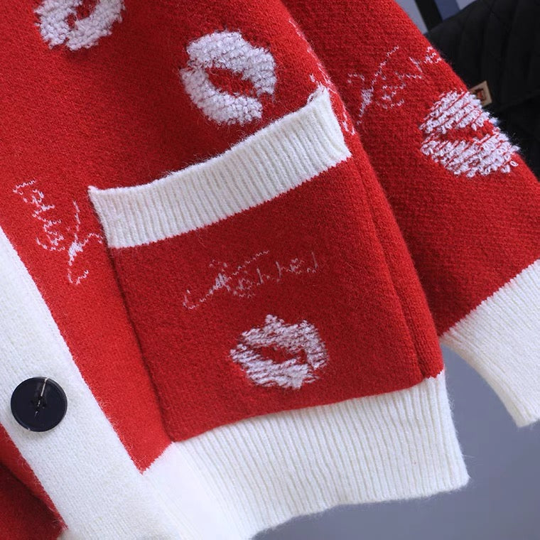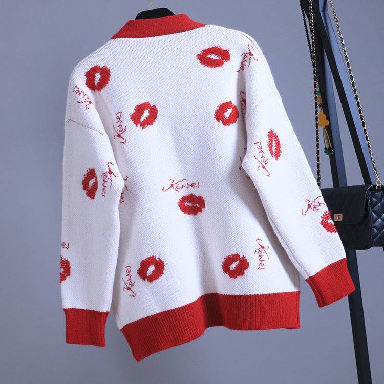 Contrast color sweater coat Cardigan, loose, V-neck, lip knit top