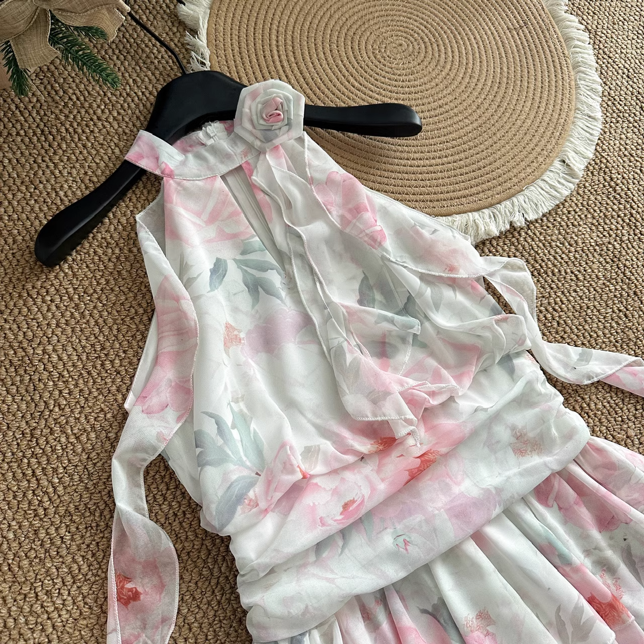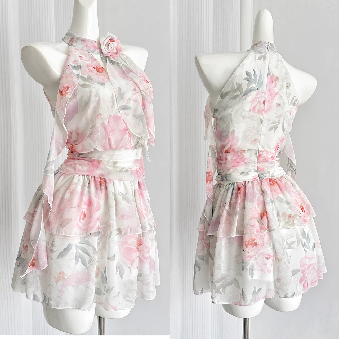 Cute A line Halter Rose Flower Sleeveless Floral Pink Dress Short Holiday Dresses SD279