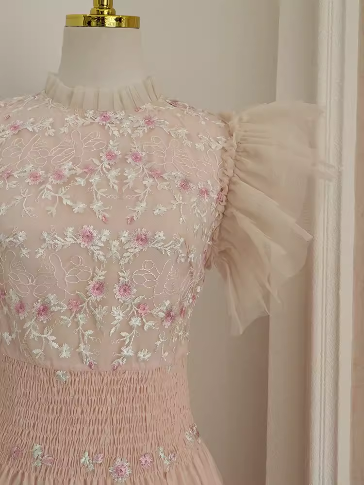 Cute A line High Neck Floral Lace Vacation Dress Tulle Long Women Dresses SD143