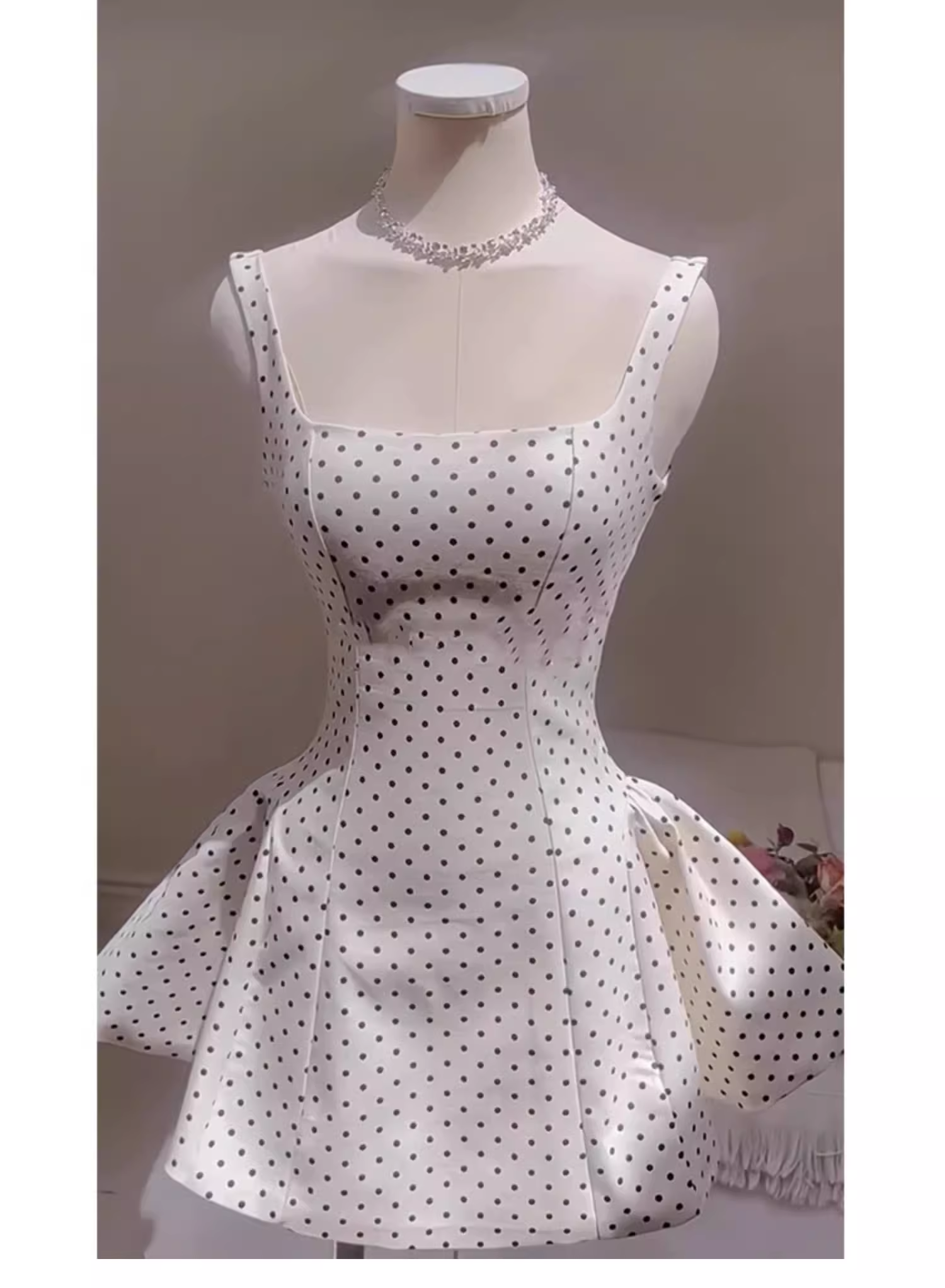 Cute A line Square Neck White Polka Dots Satin Mini Short Formal 8th Grade Homecoming Dresses Summer Middle School Hoco Dress Homecoming Outfits Birthday Dress DH631