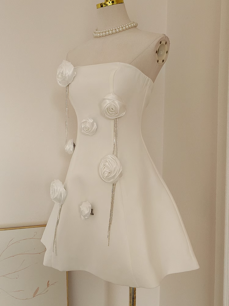 Cute A line Strapless Satin White Flowers Vacation Dress Women Short Dresses SD126