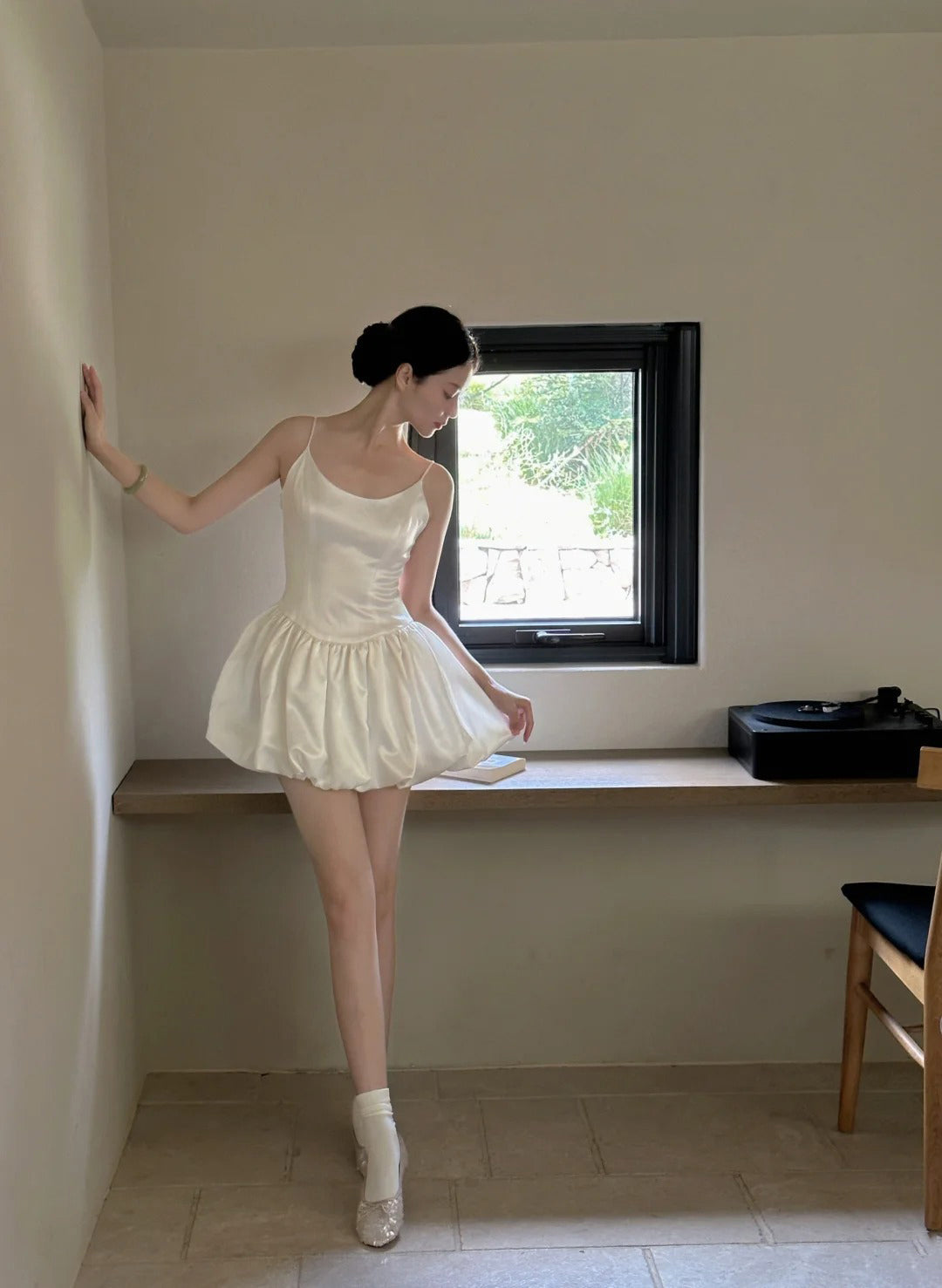 Cute Ball Gown Spaghetti Straps White Satin Short Ballet Skirt Birthday Dresses Birthday Outfits SD1166