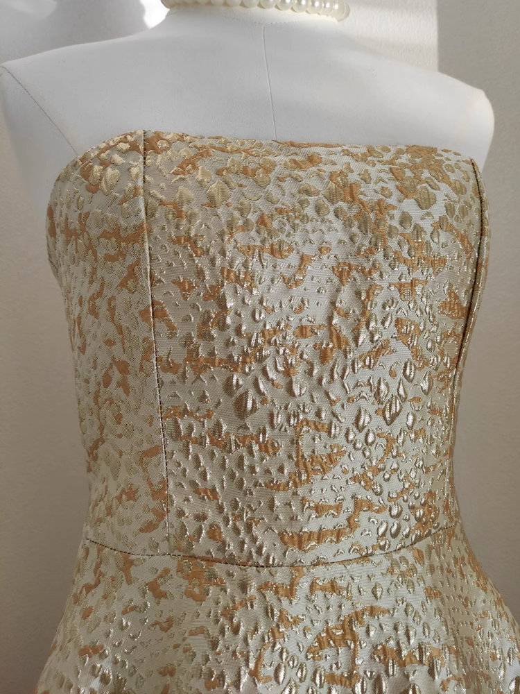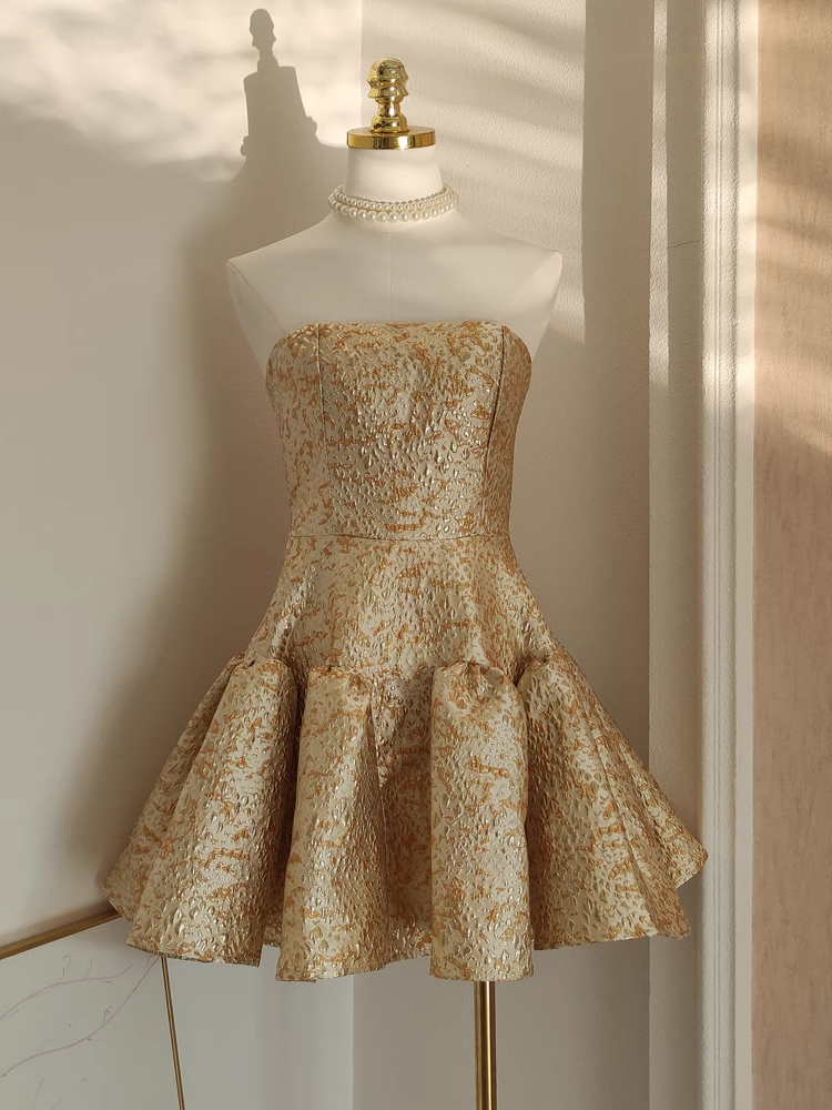 Cute Ball Gown Strapless Travel Vacation Dresses Short Satin Gold Birthday Dress SD321