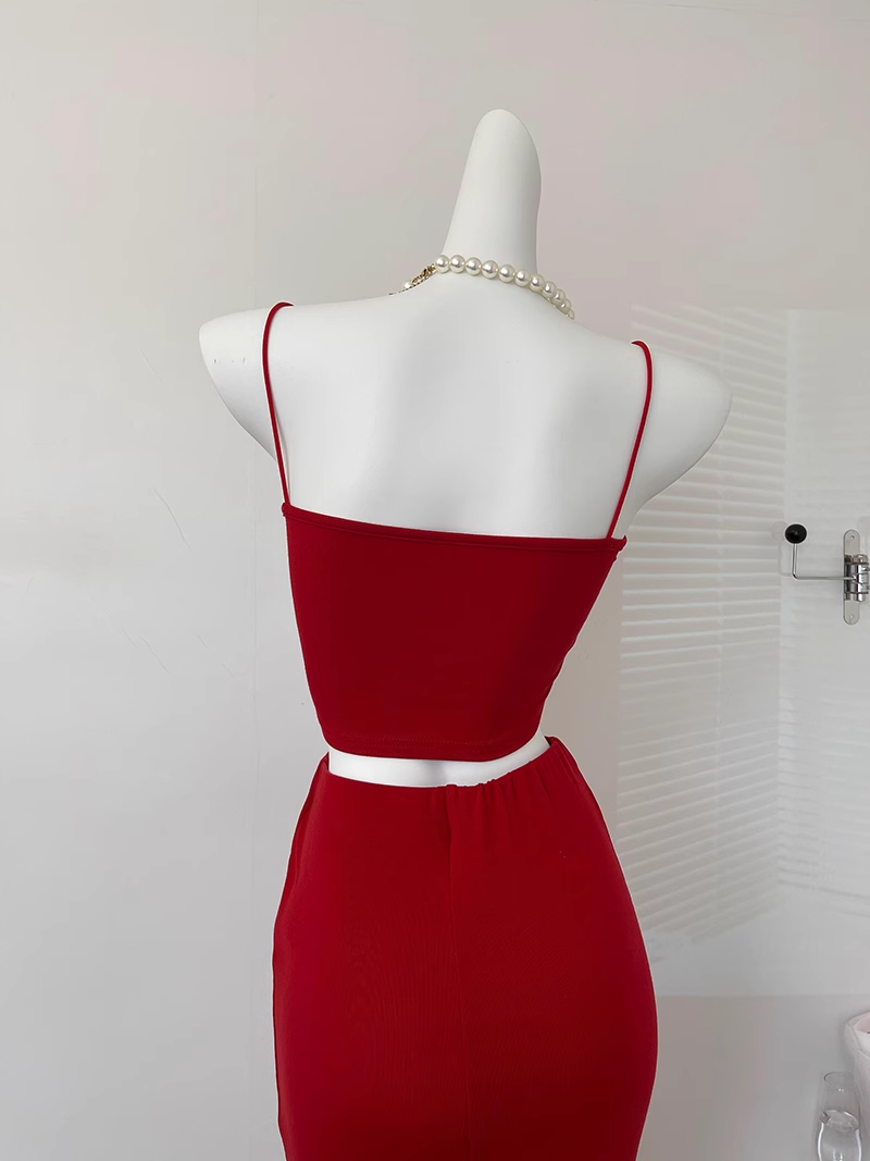 Cute Mermaid Spaghetti Straps 2 Pieces Red Long Summer Dress For Women DP0013