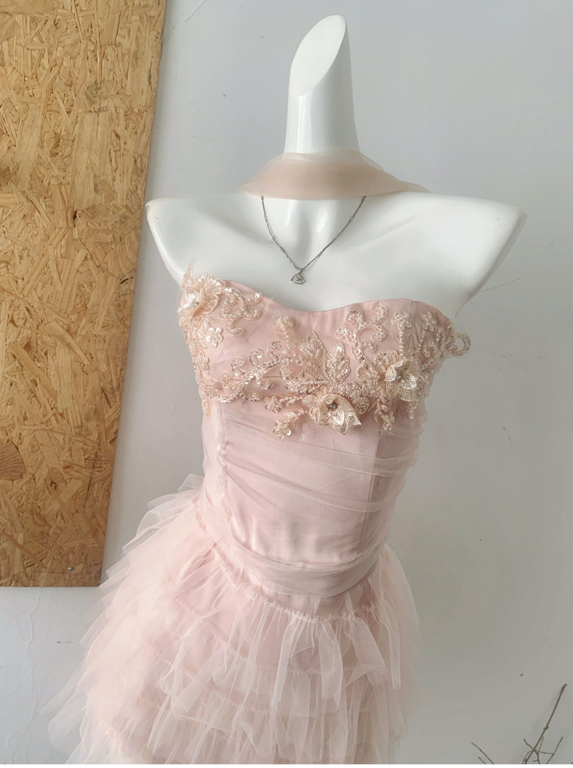 Cute Spaghetti Straps Pink Ruffles Tulle Summer Dress 2 Pieces Holiday Party Outfits For Women DP0094