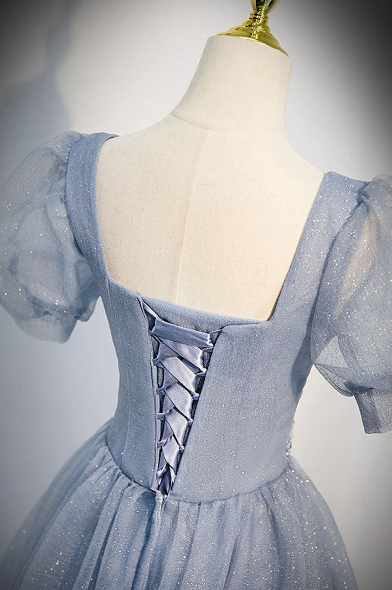 Cute Shiny Tulle Long Prom Dress, A-Line Short Sleeve Evening Party Dress