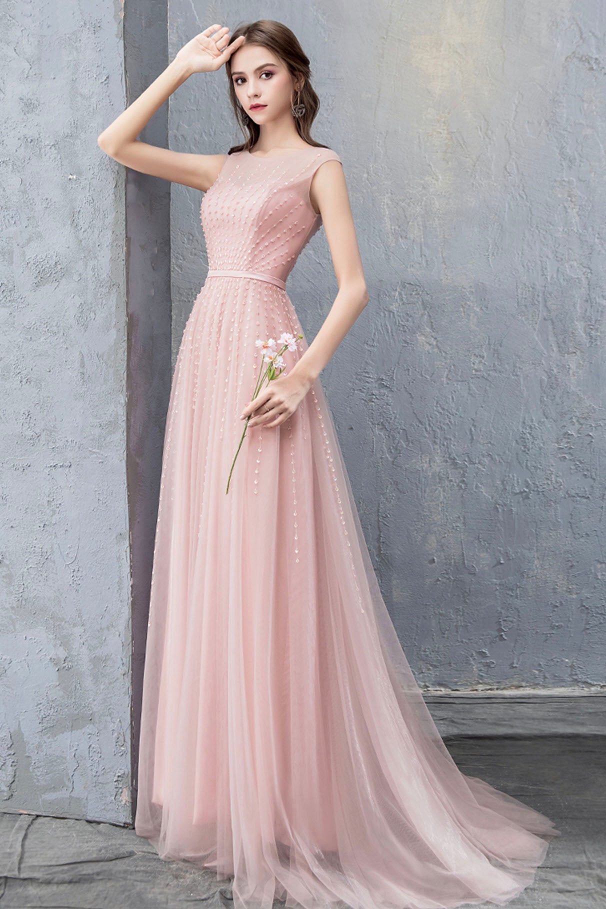 Pink Scoop Tulle Prom Dress with Beaded, Pink Floor Length Party Dress