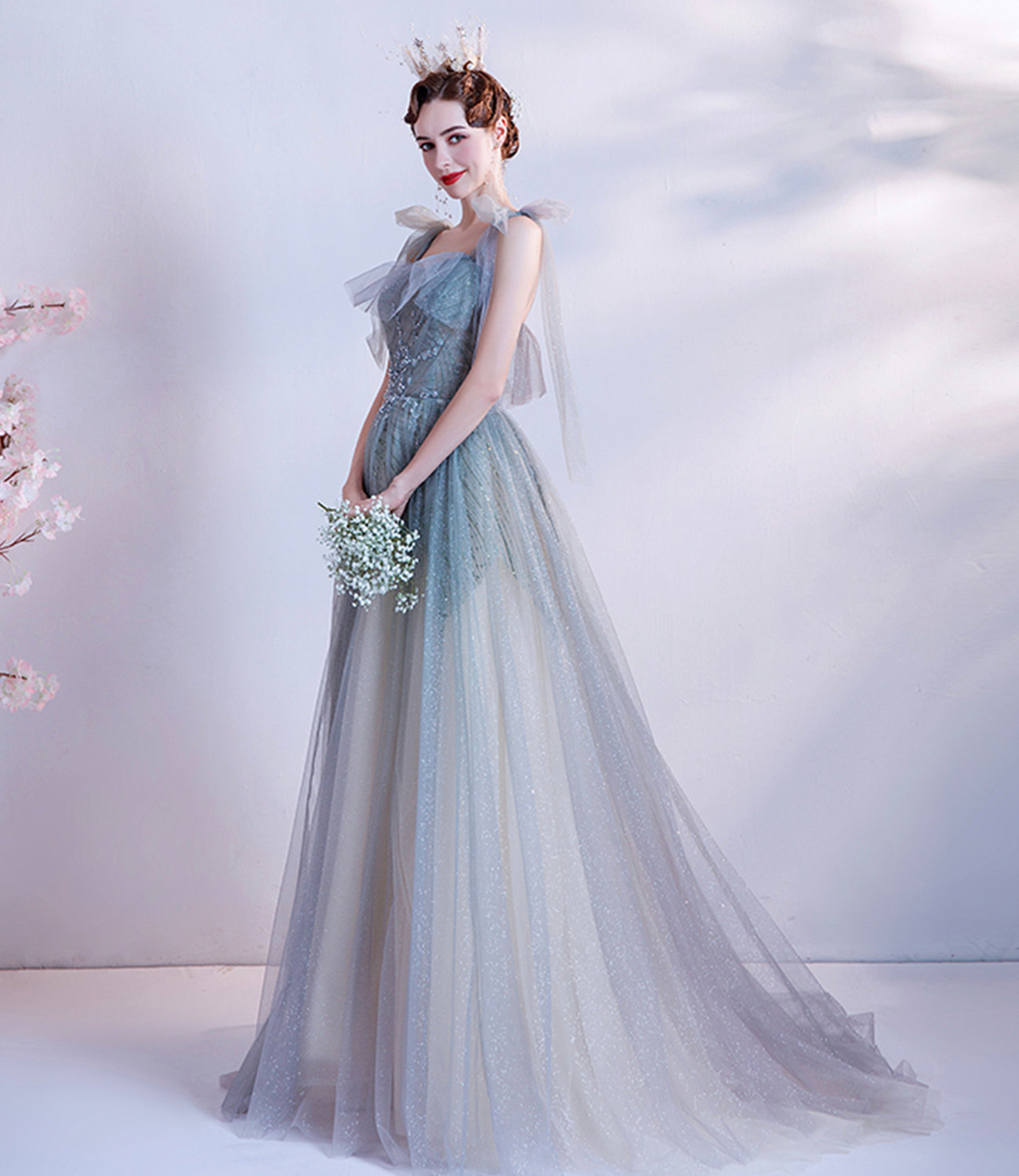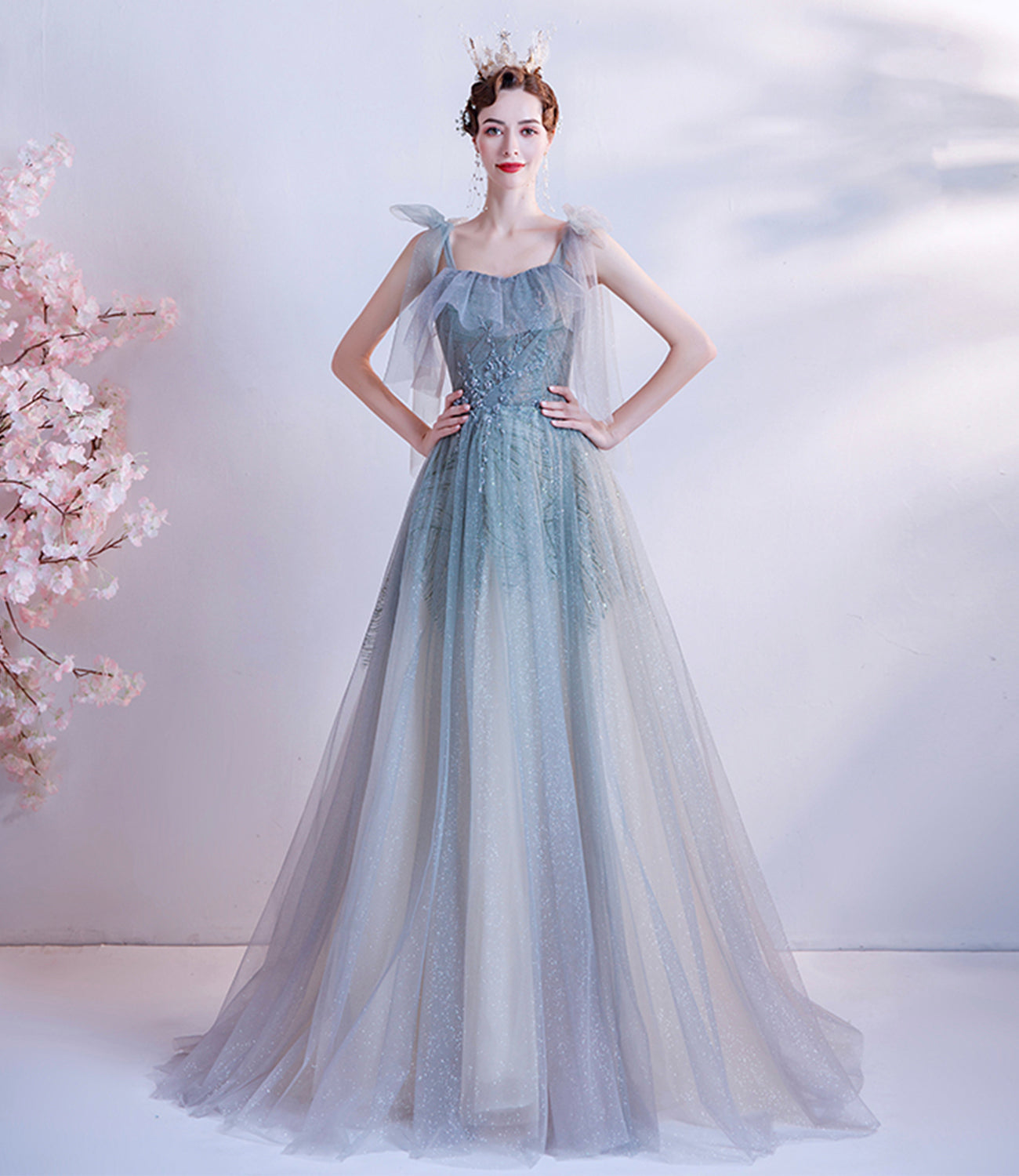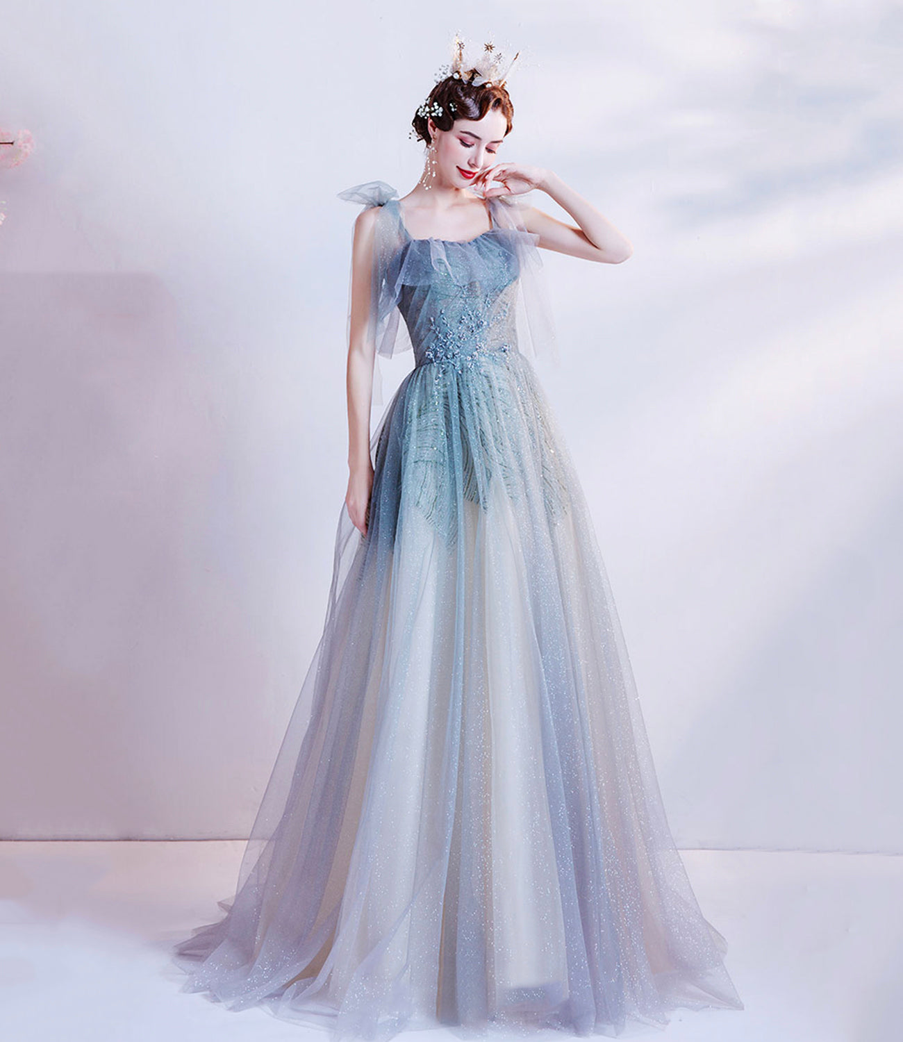 Cute tulle sequins long prom dress A line evening gown 10227