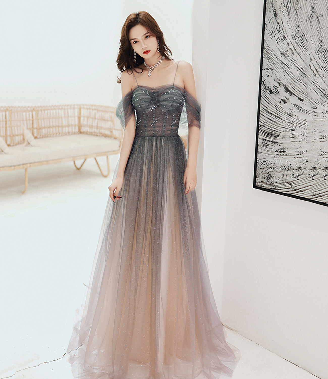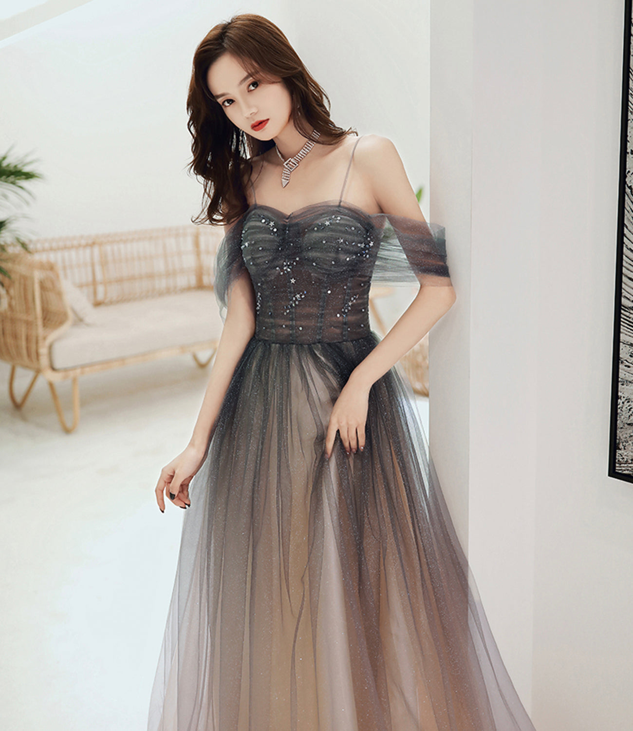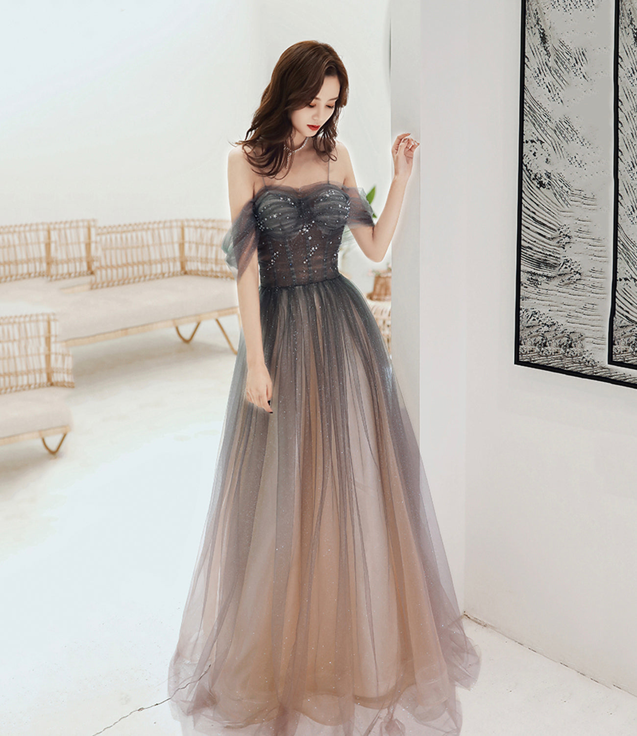 Cute tulle sequins long prom dress evening gown