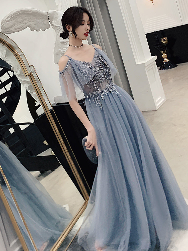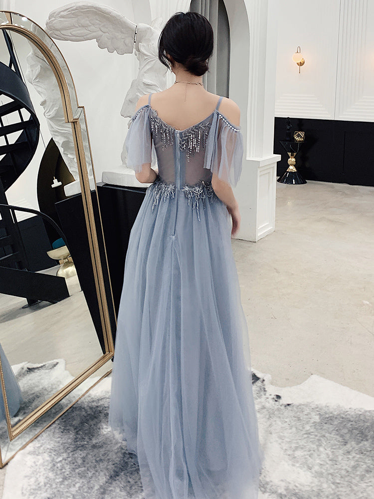 Cute v neck tulle sequins prom dress, gray evening dress 7964