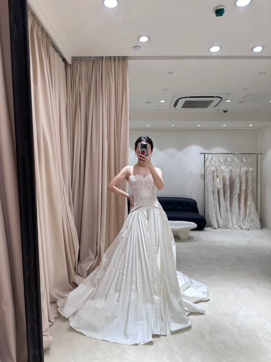 Delicate lace sweetheart neckline herringbone corset with pleated train wedding dress P3094