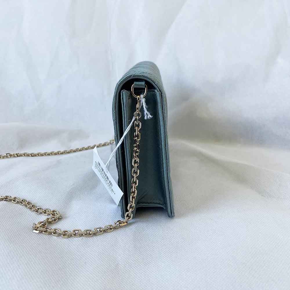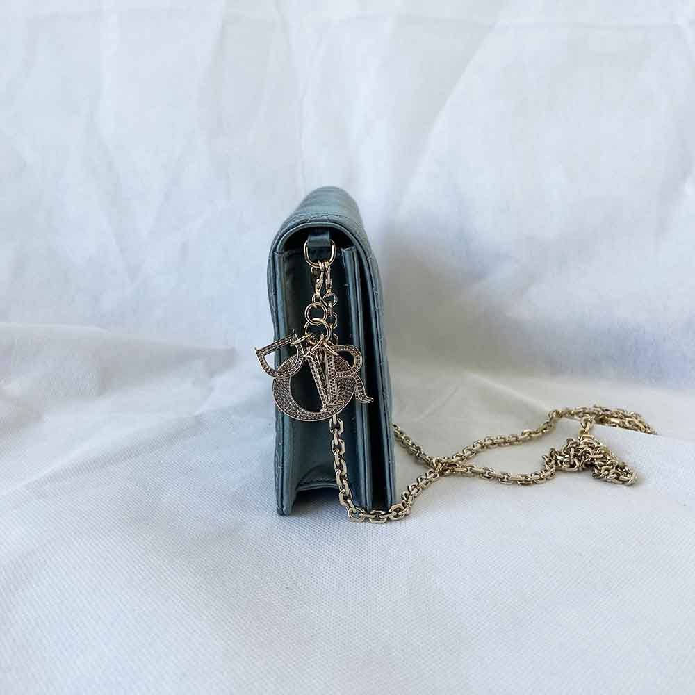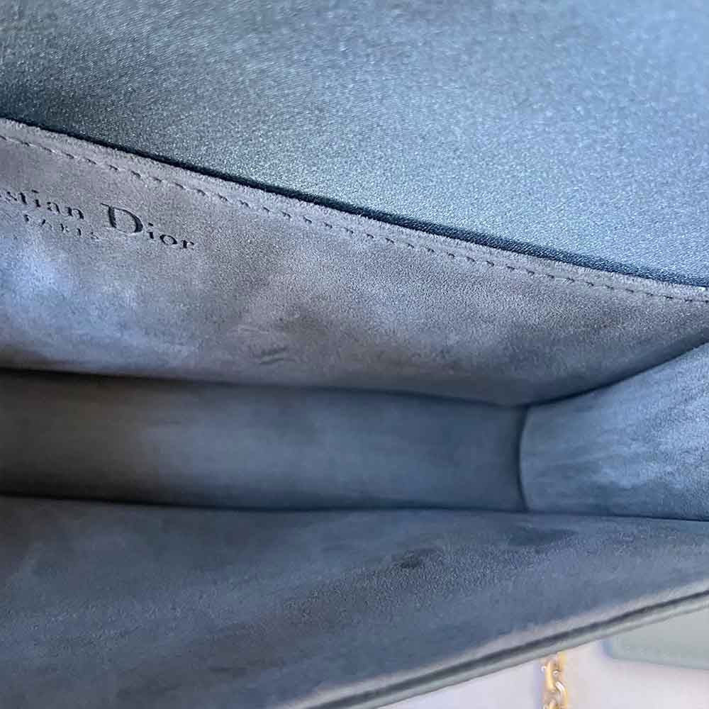 Description : The Lady Dior pouch crafted in iron grey satin, featuring emblematic Cannage topstitching and a detachable 'D.I.O.R.' crystal embellished charm. Can be worn with or without its chain strap and features two removable elements: a leather card holder and a leather zipped pouch.