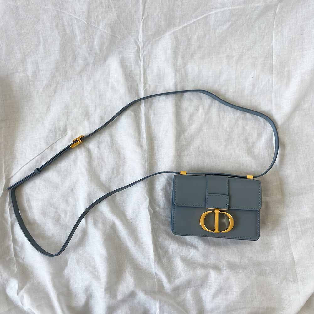 Description : Dior micro 30 Montaigne blue crossbody bag with gold hardware, featuring an adjustable crossbody strap with push lock closure.