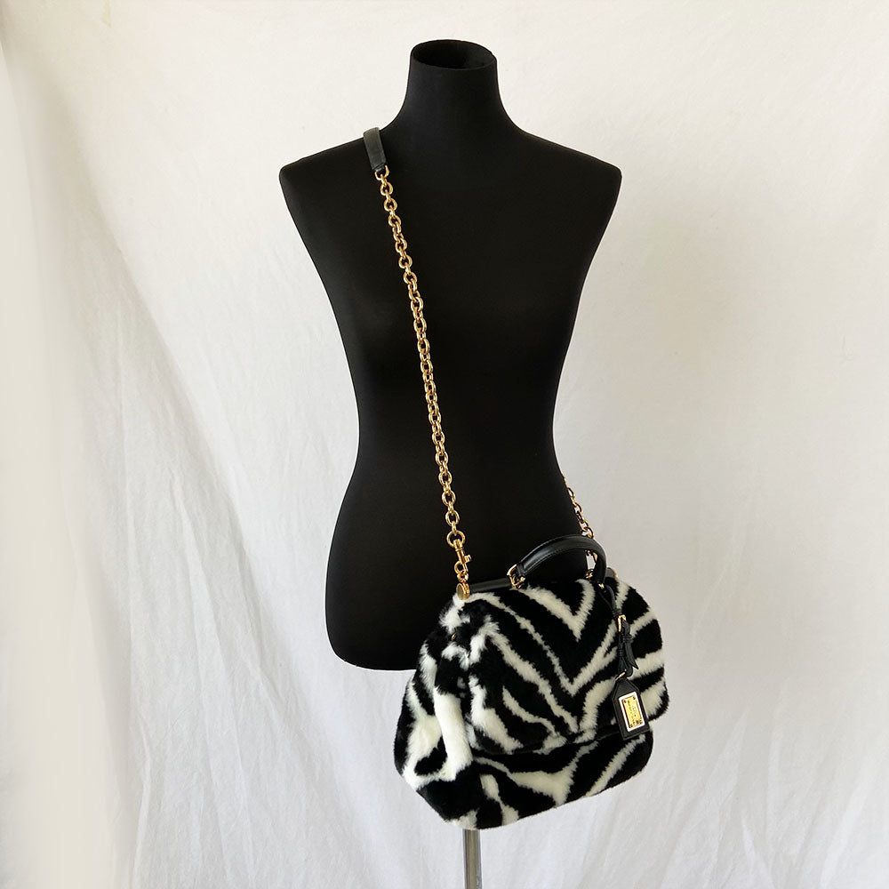 Description : Dolce & Gabbana black and white zebra fur handbag sling satchel sicily bag, includes detachable chain strap. Shoulder strap length: 58 cm. Top handle drop: 10 cm. Condition: excellent, like new