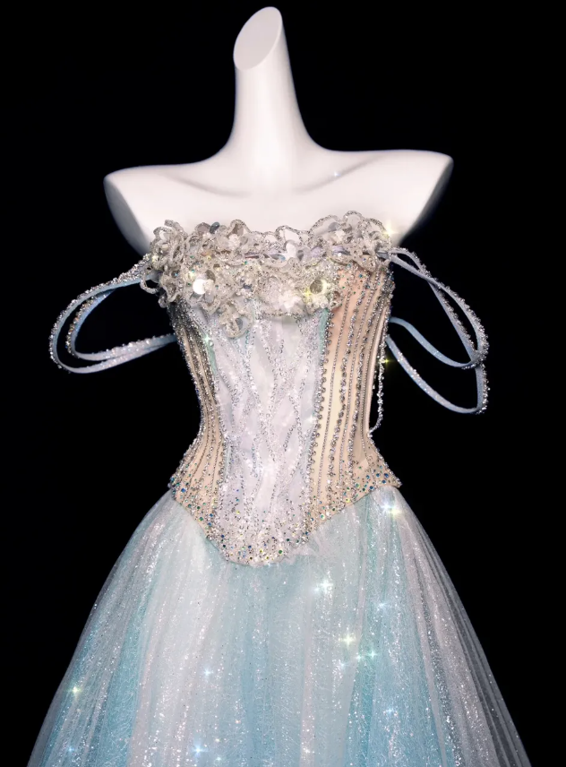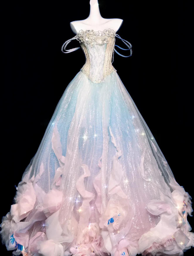 Dreamy A Line Straps Ruffle Sequin Pink Blue Tulle Long Prom Dress SH3245